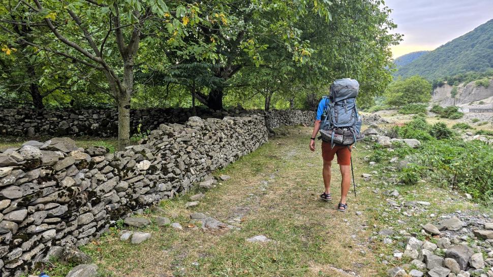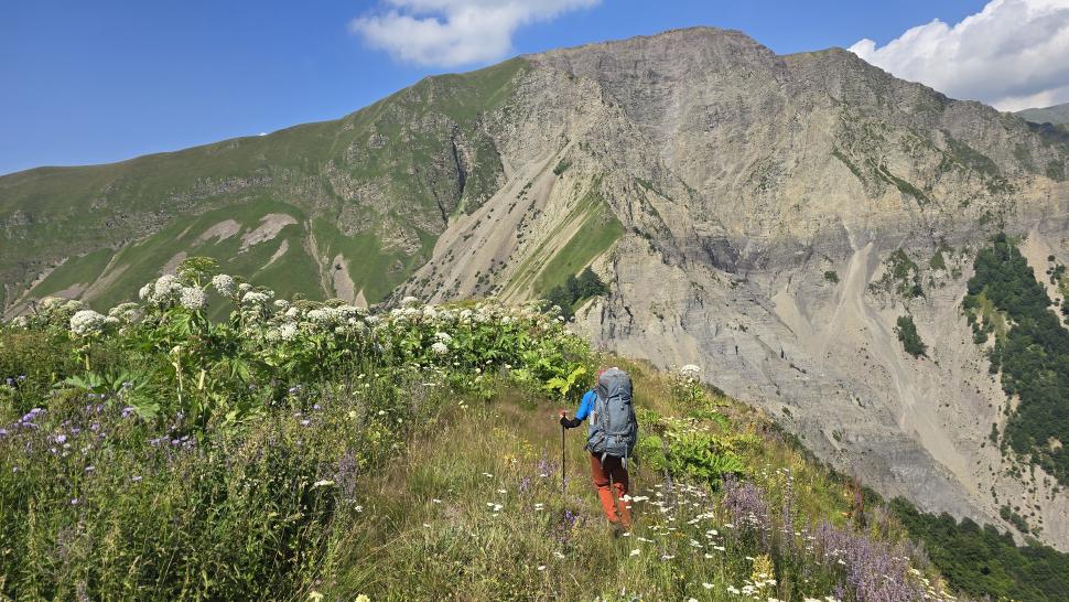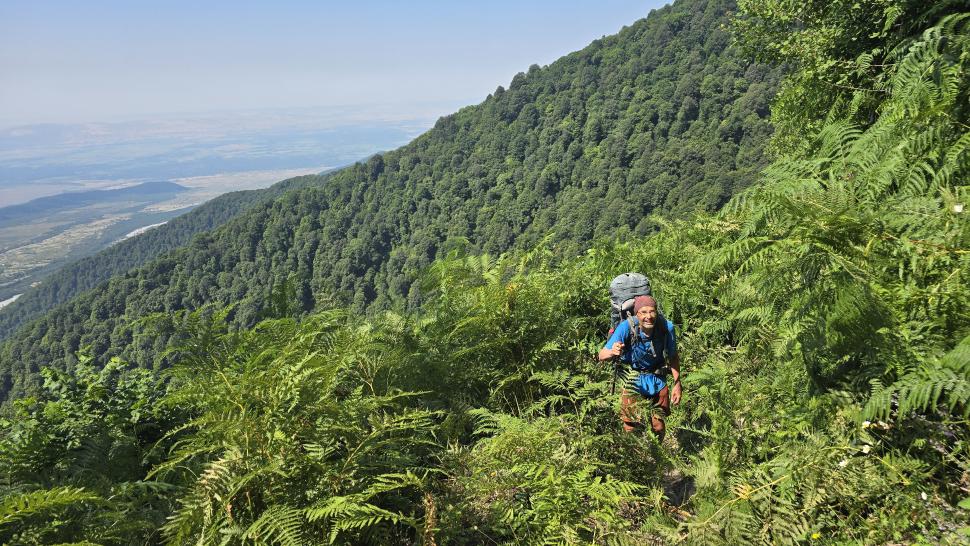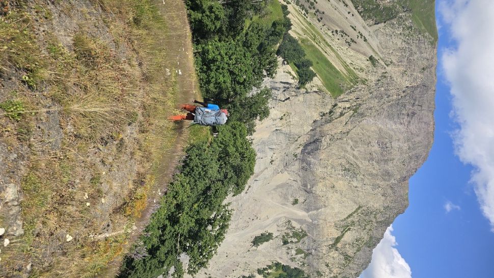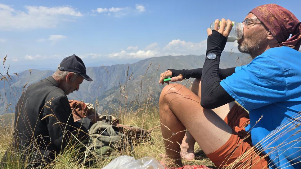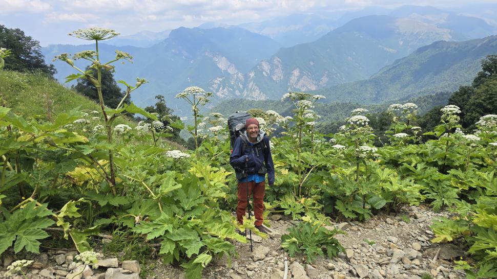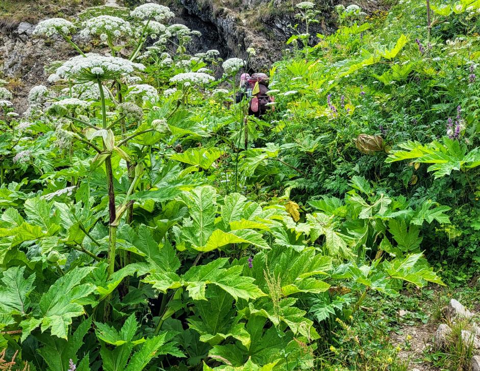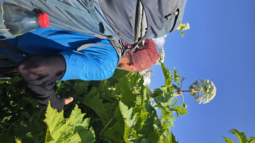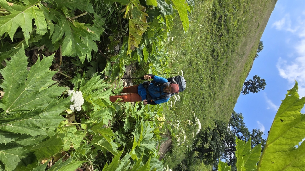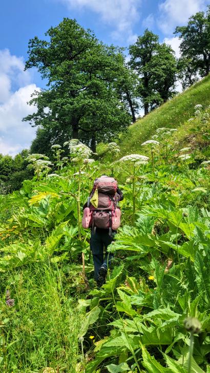 Am Morgen nutzen wir den Windschatten der Mauer beim Kaffeekochen und freuen uns über Aprikosen. Den Start haben wir uns einfacher vorgestellt. Es gibt mehrere Pfade, die nicht auf der Karte sind. Und die Quelle findet sich nicht am Bach, sondern ein Hirte zeig sie uns auf der Wiese unter einem Stein. Er füllt unsere Behälter geschickt aus dem Kanal mit frischem Wasser. Der Weg durch den Wald ist normal, aber langweilig. Oben wartet wieder Weidelandschaft auf uns, ein verlassenes Camp, und der Weg führt nun um den Hügel Kabay herum. Hier verschwindet der Pfad in Pflanzen. Ihn zwischen dem Riesenbärenklau, den Brennnesselsn und Ranken zu erkennen, ist nicht möglich. Das Vorankommen ist dramatisch langsam, und wir sind uns oft nicht sicher, wie es weitergehen soll. Wenn zwischen den Pflanzen ein Weg ausgetreten ist, so findet sich manches Mal Bären-Poo, und der Weg endet doch im dichten Riesenbärenklaufeld. Doch wieder auf den Grat ansteigen? Ja, um das Feld herum kommen wir an ein weiteres verlassenes Camp. Hier hat sich der Riesenbärenklau ein großes Feld erobert. Gegenüber am nächsten Berghang sieht es nicht mehr überwachsen aus, eher dass es erodierte Geröllhänge geben könnte, nunja. Der Weg vom Camp führt abwärts in den Wald, endlich bleiben angedeutete Pfadspuren länger erhalten. Sie führen sicher auf den anderen Berghang und unter den Geröllhängen entlang.