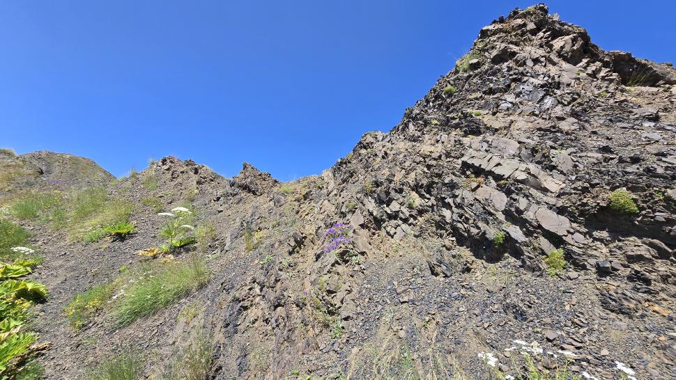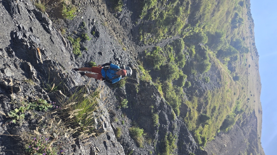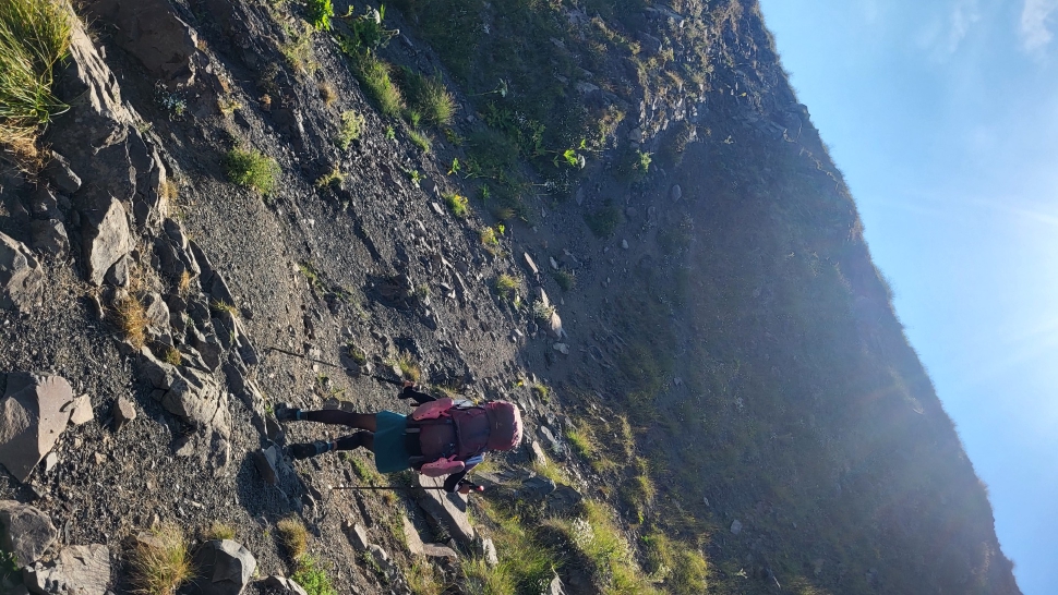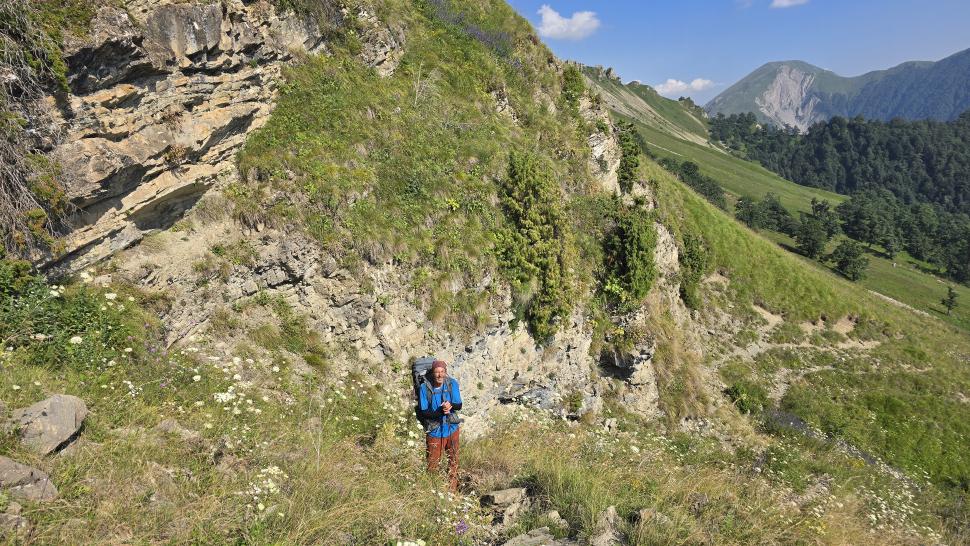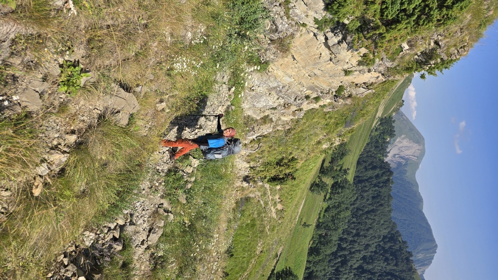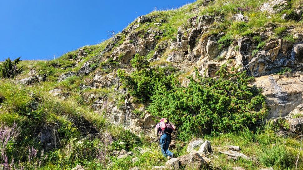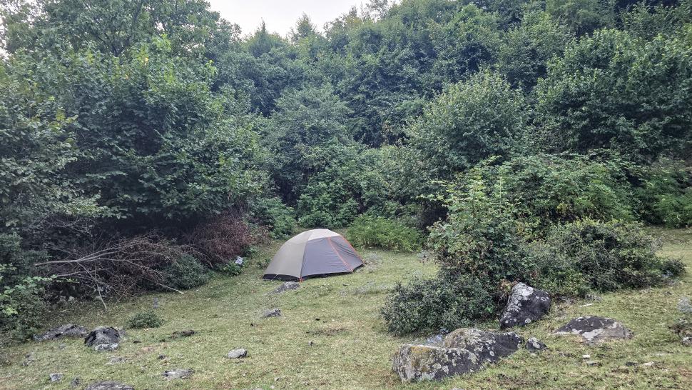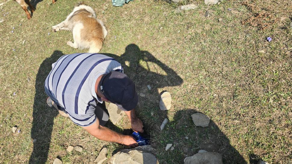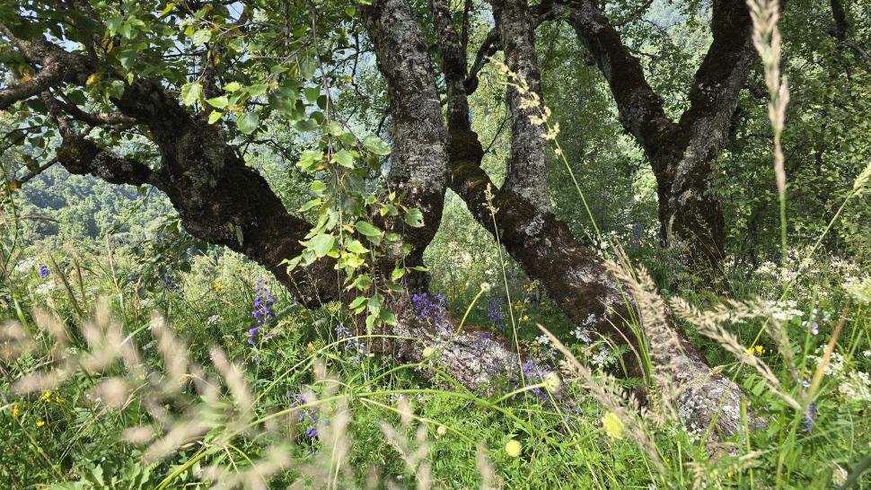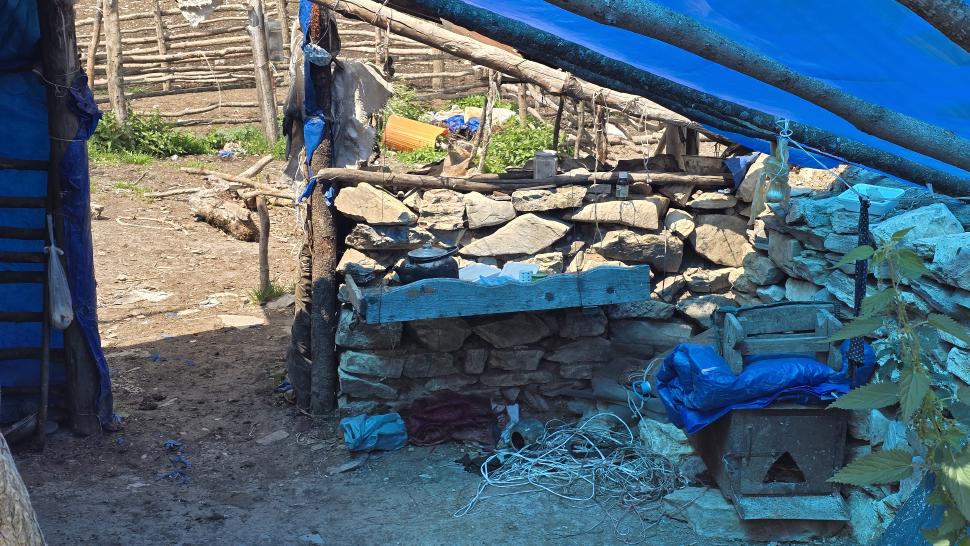 Am Morgen nutzen wir den Windschatten der Mauer beim Kaffeekochen und freuen uns über Aprikosen. Den Start haben wir uns einfacher vorgestellt. Es gibt mehrere Pfade, die nicht auf der Karte sind. Und die Quelle findet sich nicht am Bach, sondern ein Hirte zeig sie uns auf der Wiese unter einem Stein. Er füllt unsere Behälter geschickt aus dem Kanal mit frischem Wasser. Der Weg durch den Wald ist normal, aber langweilig. Oben wartet wieder Weidelandschaft auf uns, ein verlassenes Camp, und der Weg führt nun um den Hügel Kabay herum. Hier verschwindet der Pfad in Pflanzen. Ihn zwischen dem Riesenbärenklau, den Brennnesselsn und Ranken zu erkennen, ist nicht möglich. Das Vorankommen ist dramatisch langsam, und wir sind uns oft nicht sicher, wie es weitergehen soll. Wenn zwischen den Pflanzen ein Weg ausgetreten ist, so findet sich manches Mal Bären-Poo, und der Weg endet doch im dichten Riesenbärenklaufeld. Doch wieder auf den Grat ansteigen? Ja, um das Feld herum kommen wir an ein weiteres verlassenes Camp. Hier hat sich der Riesenbärenklau ein großes Feld erobert. Gegenüber am nächsten Berghang sieht es nicht mehr überwachsen aus, eher dass es erodierte Geröllhänge geben könnte, nunja. Der Weg vom Camp führt abwärts in den Wald, endlich bleiben angedeutete Pfadspuren länger erhalten. Sie führen sicher auf den anderen Berghang und unter den Geröllhängen entlang.