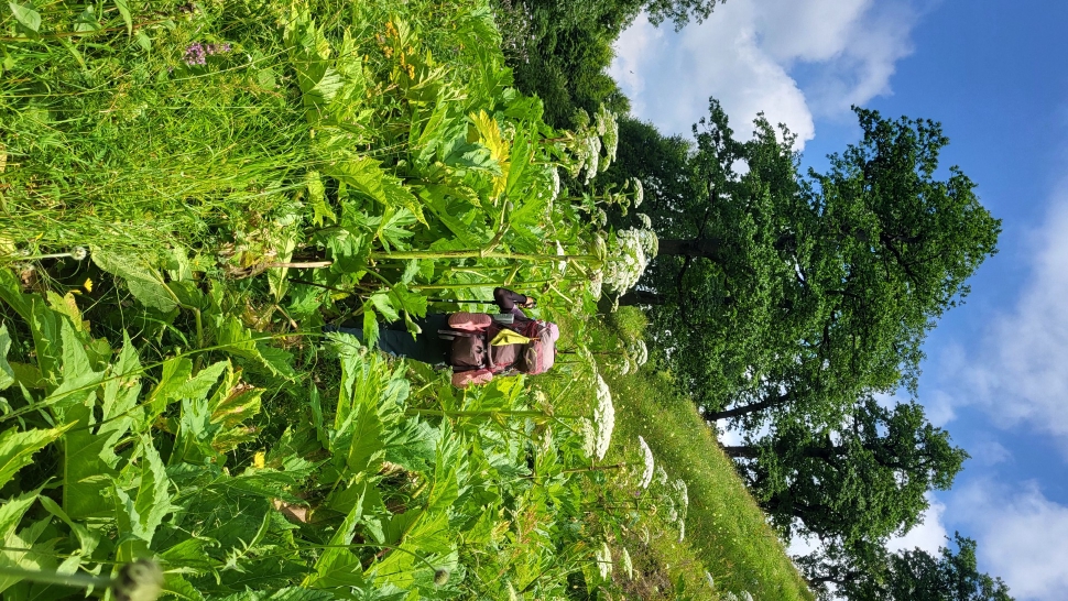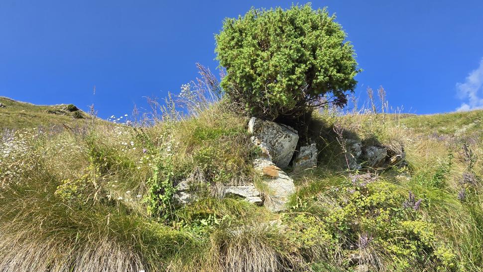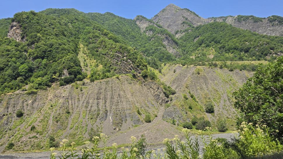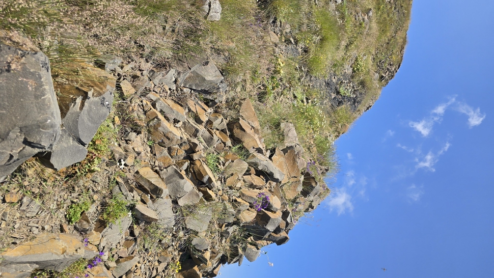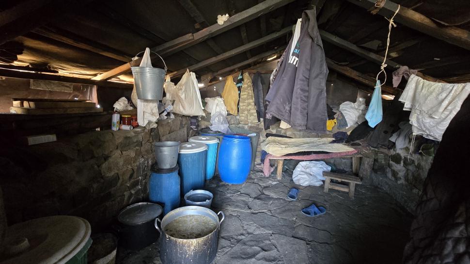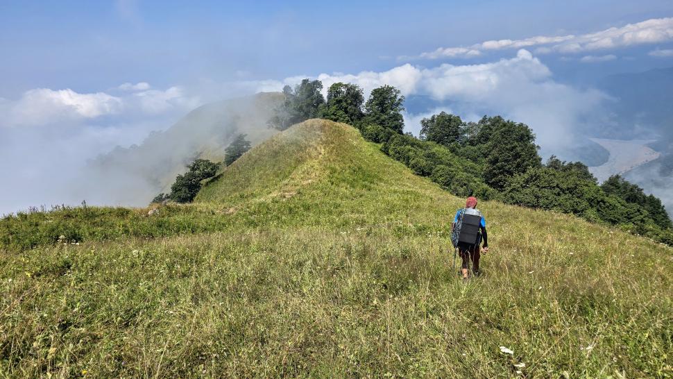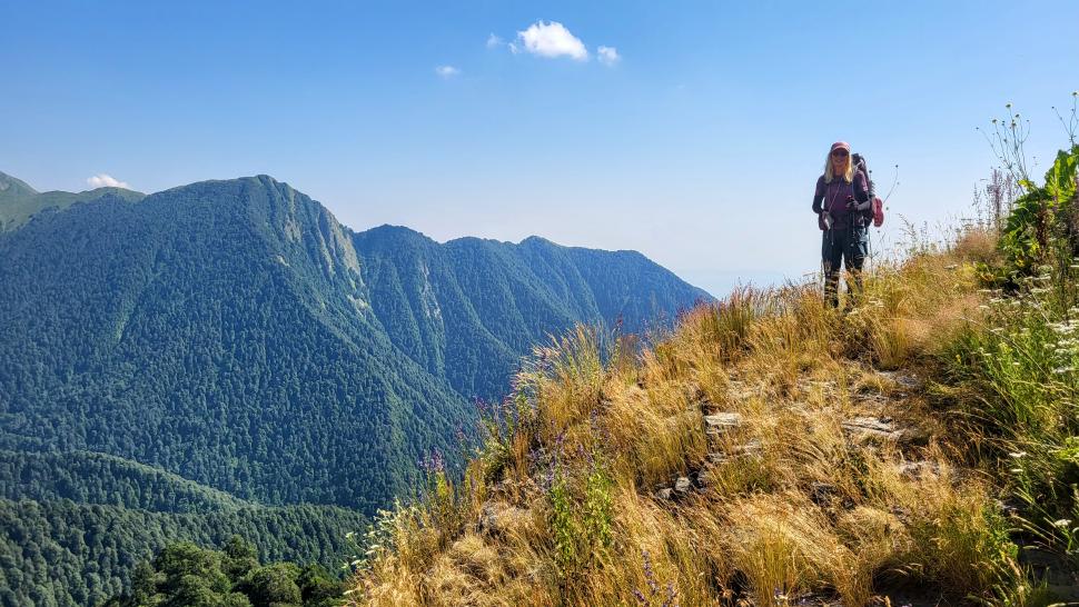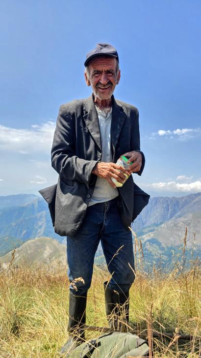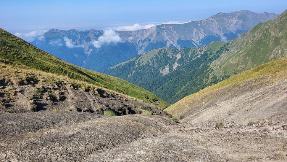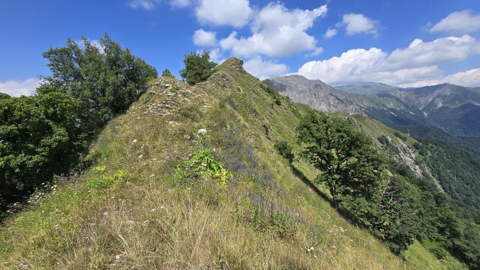 Am Morgen nutzen wir den Windschatten der Mauer beim Kaffeekochen und freuen uns über Aprikosen. Den Start haben wir uns einfacher vorgestellt. Es gibt mehrere Pfade, die nicht auf der Karte sind. Und die Quelle findet sich nicht am Bach, sondern ein Hirte zeig sie uns auf der Wiese unter einem Stein. Er füllt unsere Behälter geschickt aus dem Kanal mit frischem Wasser. Der Weg durch den Wald ist normal, aber langweilig. Oben wartet wieder Weidelandschaft auf uns, ein verlassenes Camp, und der Weg führt nun um den Hügel Kabay herum. Hier verschwindet der Pfad in Pflanzen. Ihn zwischen dem Riesenbärenklau, den Brennnesselsn und Ranken zu erkennen, ist nicht möglich. Das Vorankommen ist dramatisch langsam, und wir sind uns oft nicht sicher, wie es weitergehen soll. Wenn zwischen den Pflanzen ein Weg ausgetreten ist, so findet sich manches Mal Bären-Poo, und der Weg endet doch im dichten Riesenbärenklaufeld. Doch wieder auf den Grat ansteigen? Ja, um das Feld herum kommen wir an ein weiteres verlassenes Camp. Hier hat sich der Riesenbärenklau ein großes Feld erobert. Gegenüber am nächsten Berghang sieht es nicht mehr überwachsen aus, eher dass es erodierte Geröllhänge geben könnte, nunja. Der Weg vom Camp führt abwärts in den Wald, endlich bleiben angedeutete Pfadspuren länger erhalten. Sie führen sicher auf den anderen Berghang und unter den Geröllhängen entlang.