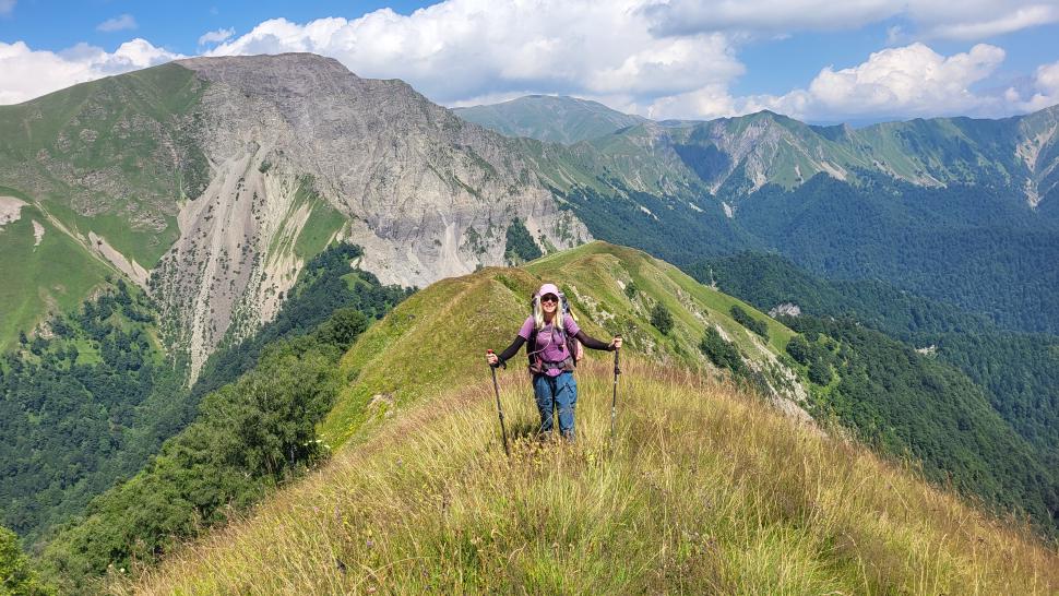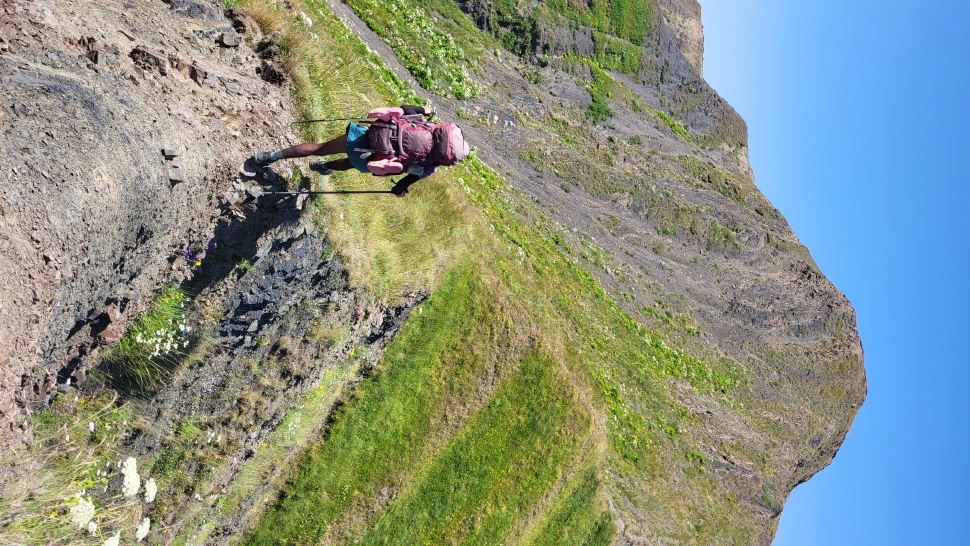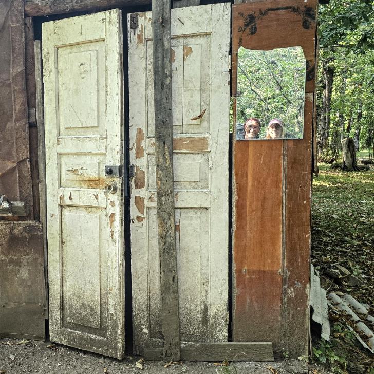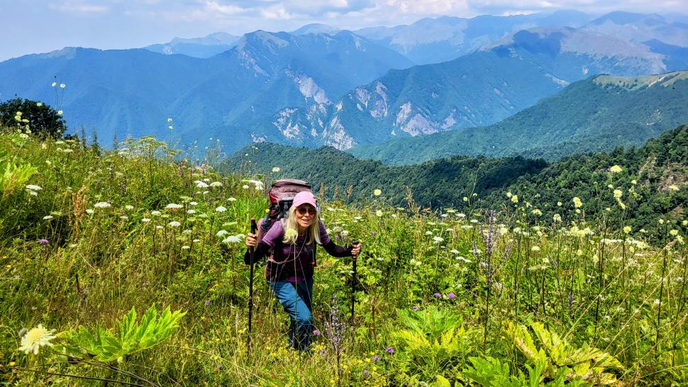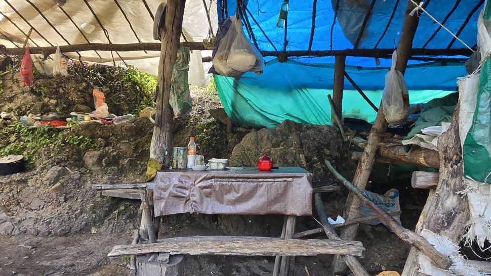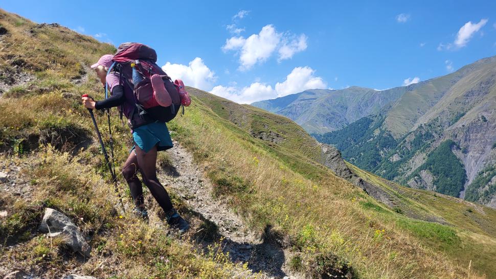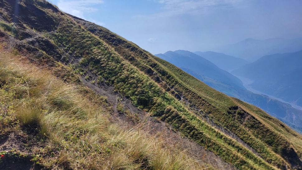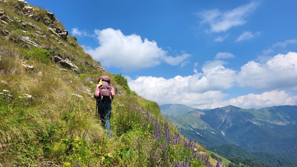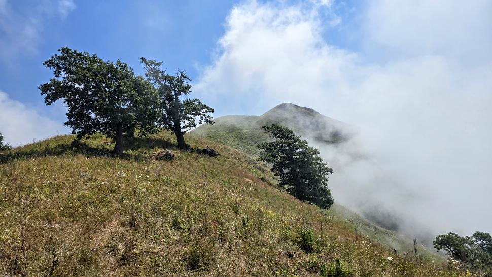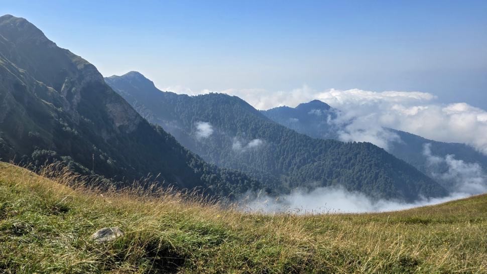 Am Morgen nutzen wir den Windschatten der Mauer beim Kaffeekochen und freuen uns über Aprikosen. Den Start haben wir uns einfacher vorgestellt. Es gibt mehrere Pfade, die nicht auf der Karte sind. Und die Quelle findet sich nicht am Bach, sondern ein Hirte zeig sie uns auf der Wiese unter einem Stein. Er füllt unsere Behälter geschickt aus dem Kanal mit frischem Wasser. Der Weg durch den Wald ist normal, aber langweilig. Oben wartet wieder Weidelandschaft auf uns, ein verlassenes Camp, und der Weg führt nun um den Hügel Kabay herum. Hier verschwindet der Pfad in Pflanzen. Ihn zwischen dem Riesenbärenklau, den Brennnesselsn und Ranken zu erkennen, ist nicht möglich. Das Vorankommen ist dramatisch langsam, und wir sind uns oft nicht sicher, wie es weitergehen soll. Wenn zwischen den Pflanzen ein Weg ausgetreten ist, so findet sich manches Mal Bären-Poo, und der Weg endet doch im dichten Riesenbärenklaufeld. Doch wieder auf den Grat ansteigen? Ja, um das Feld herum kommen wir an ein weiteres verlassenes Camp. Hier hat sich der Riesenbärenklau ein großes Feld erobert. Gegenüber am nächsten Berghang sieht es nicht mehr überwachsen aus, eher dass es erodierte Geröllhänge geben könnte, nunja. Der Weg vom Camp führt abwärts in den Wald, endlich bleiben angedeutete Pfadspuren länger erhalten. Sie führen sicher auf den anderen Berghang und unter den Geröllhängen entlang.