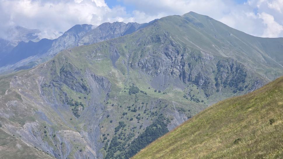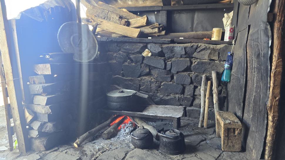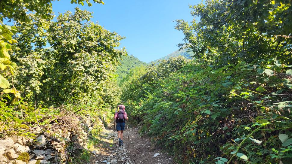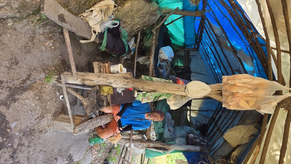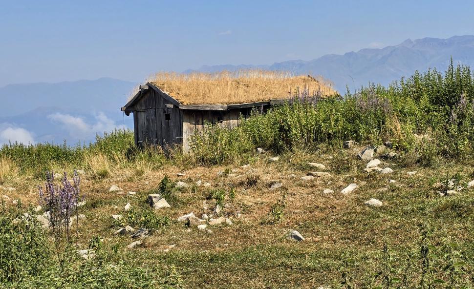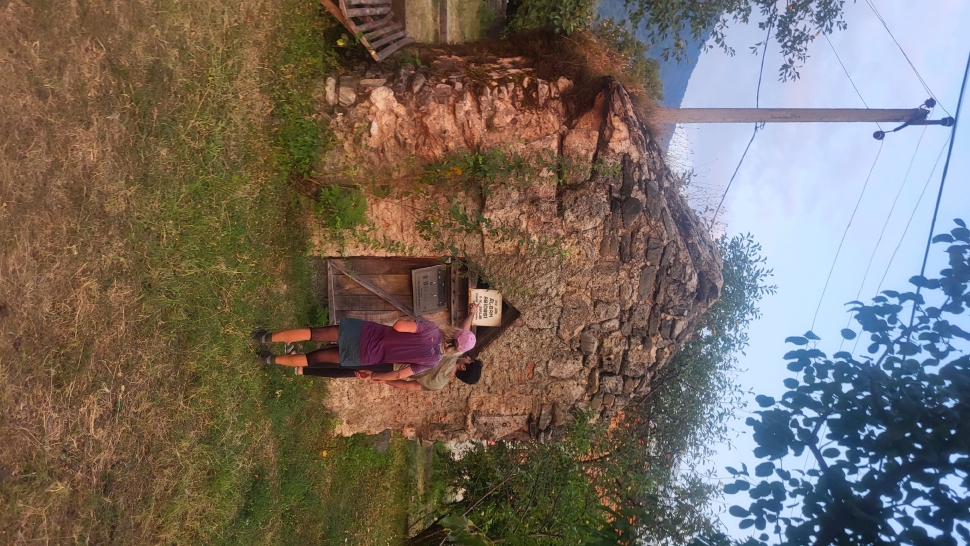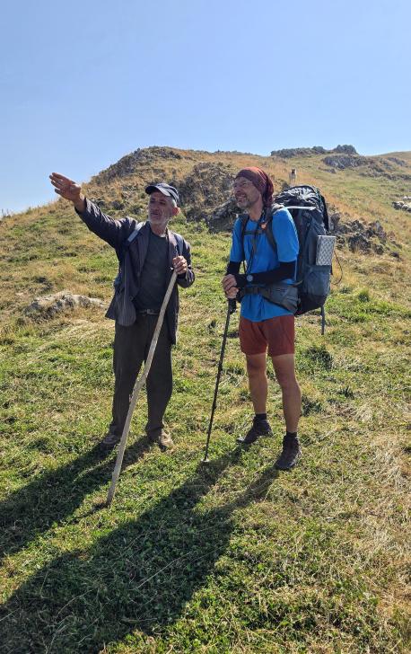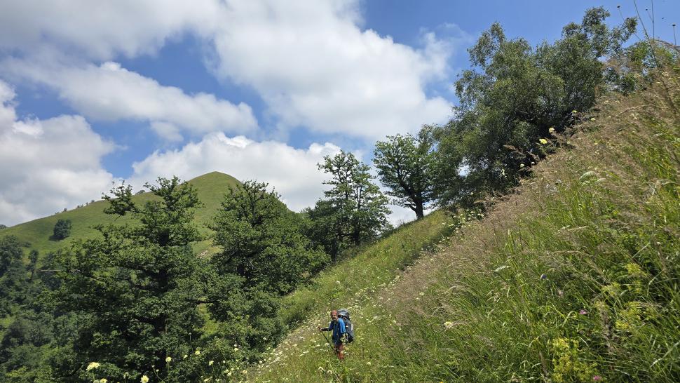 Dann geht es doch leider wieder hinab in den Wald. Ein paar Rinder laufen vor uns her steil abwärts durch den Wald und über Lichtungen. Dann bleiben sie in einem Waldabschnitt, und wir passieren weiter abwärts. Im Wald immer noch auf 1500 m Höhe kommen wir zum letzten Shelter. Wir werden eingeladen, hier nehmen wir an. Tee, Brot, dann noch eine Suppe, viel Austausch, fast 2 Stunden. Dann gehen wir beim Abstieg nach Mamrux zunächst über Wiesen. Der Weg ist nicht mehr so deutlich, bleibt auch im Wald fast auf der gleichen Höhe. Hier ist er nochmal breit, aber laut Karte geht nun ein kleiner Pfad links weggegabelt weiter und steigt entlang von Gratabschnitten auch wieder an, aber wird immer undeutlicher bzw. verschwindet sogar. Wir zweifeln und verlaufen uns auch deshalb. Der gpx-Pfad ist in der Realität nur noch eine Idee des Durchkommens. Immer wieder sind Brombeerfelder im Weg oder das Unterholz wird in anderer Weise dichter. Es ist ein unangenehmer Kampf und Krampf, das kann nicht richtig sein. Aber die letzten klaren Wege verliefen in die falsche Richtung. Daher bleiben wir im Durchhalte-Modus, zumal es endlich wirklich bergab geht. Aber es dauert noch eine anstrengende Stunde, bevor wir wieder einen wirklichen Weg haben. Das letzte Stück davor ist noch einmal besonders steil und unwegsam.