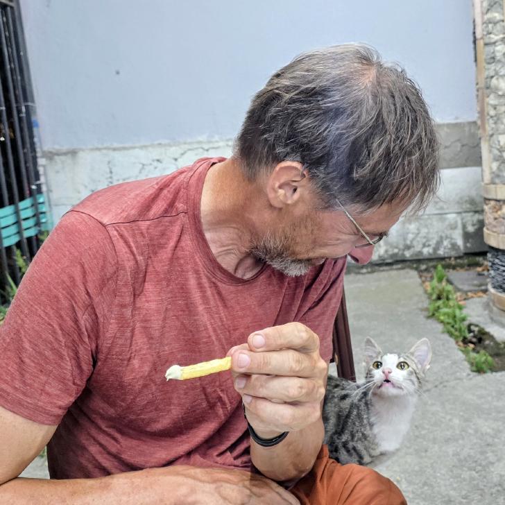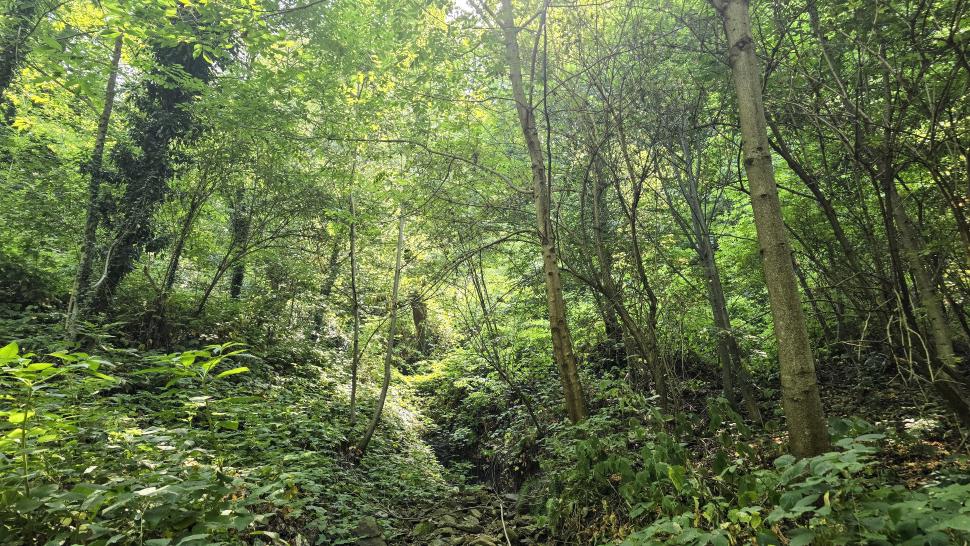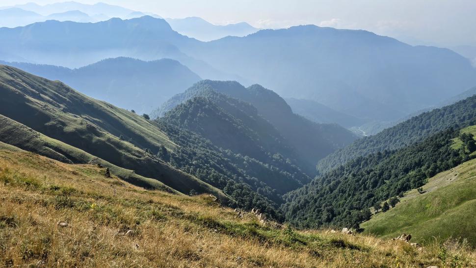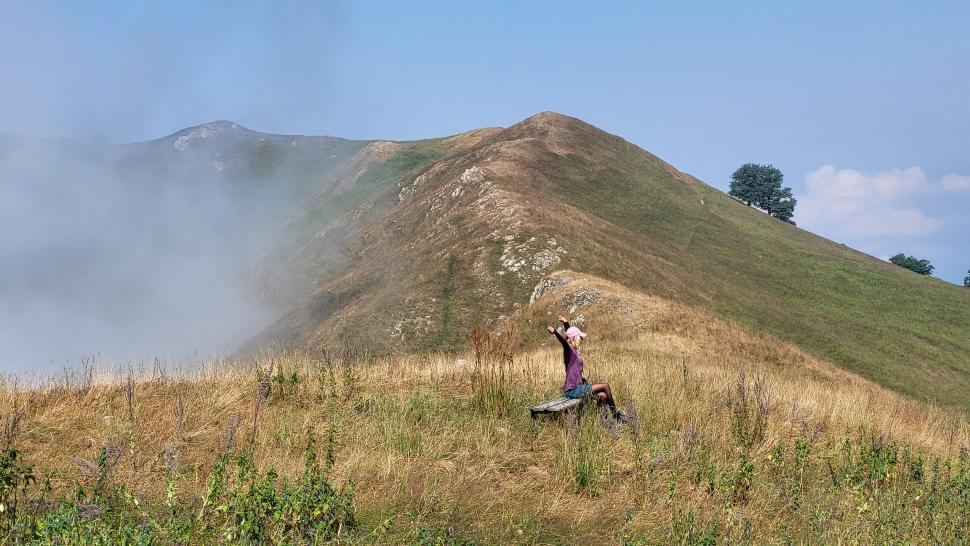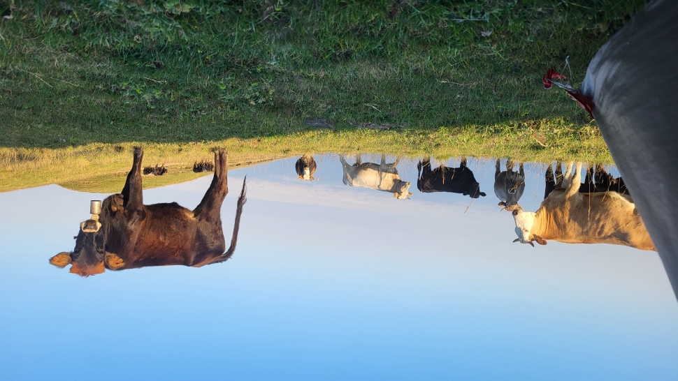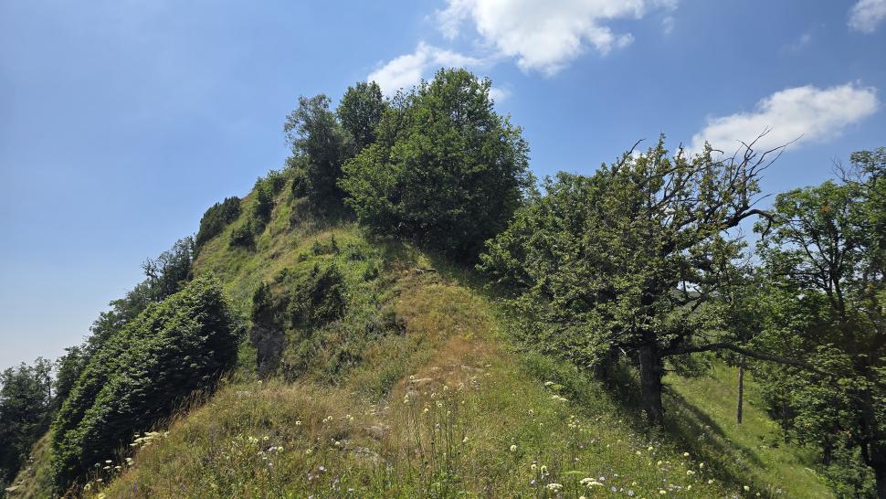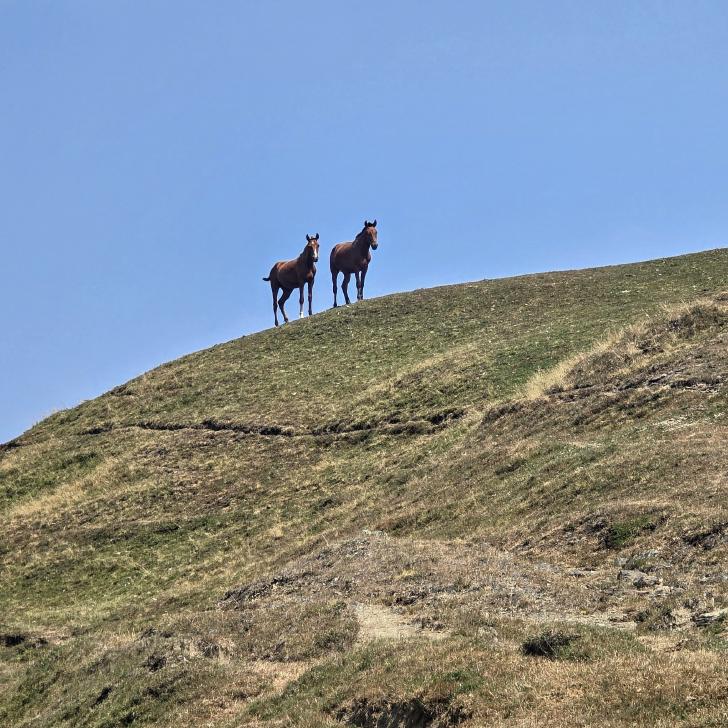 Dann geht es doch leider wieder hinab in den Wald. Ein paar Rinder laufen vor uns her steil abwärts durch den Wald und über Lichtungen. Dann bleiben sie in einem Waldabschnitt, und wir passieren weiter abwärts. Im Wald immer noch auf 1500 m Höhe kommen wir zum letzten Shelter. Wir werden eingeladen, hier nehmen wir an. Tee, Brot, dann noch eine Suppe, viel Austausch, fast 2 Stunden. Dann gehen wir beim Abstieg nach Mamrux zunächst über Wiesen. Der Weg ist nicht mehr so deutlich, bleibt auch im Wald fast auf der gleichen Höhe. Hier ist er nochmal breit, aber laut Karte geht nun ein kleiner Pfad links weggegabelt weiter und steigt entlang von Gratabschnitten auch wieder an, aber wird immer undeutlicher bzw. verschwindet sogar. Wir zweifeln und verlaufen uns auch deshalb. Der gpx-Pfad ist in der Realität nur noch eine Idee des Durchkommens. Immer wieder sind Brombeerfelder im Weg oder das Unterholz wird in anderer Weise dichter. Es ist ein unangenehmer Kampf und Krampf, das kann nicht richtig sein. Aber die letzten klaren Wege verliefen in die falsche Richtung. Daher bleiben wir im Durchhalte-Modus, zumal es endlich wirklich bergab geht. Aber es dauert noch eine anstrengende Stunde, bevor wir wieder einen wirklichen Weg haben. Das letzte Stück davor ist noch einmal besonders steil und unwegsam.