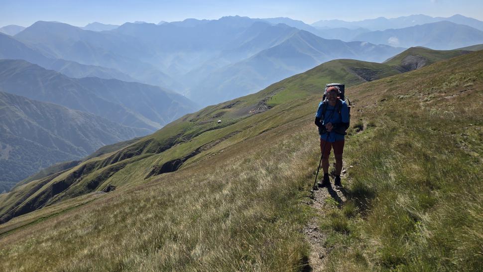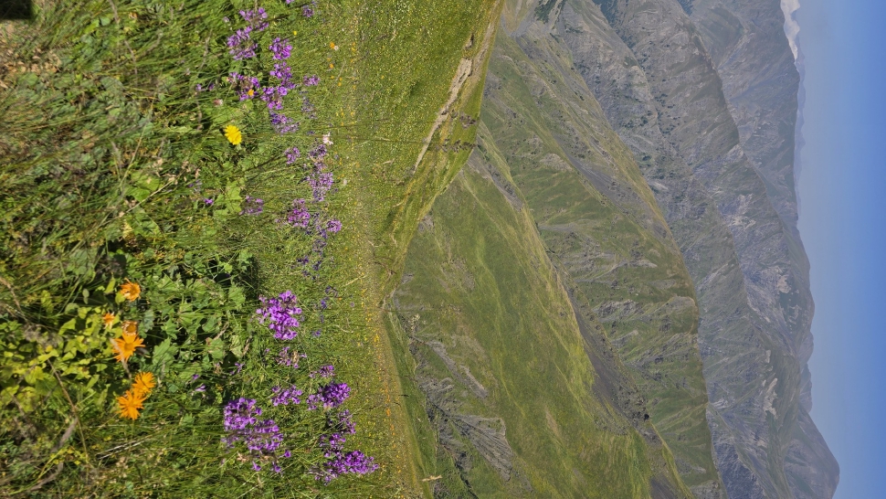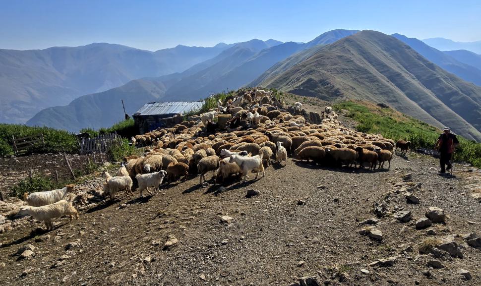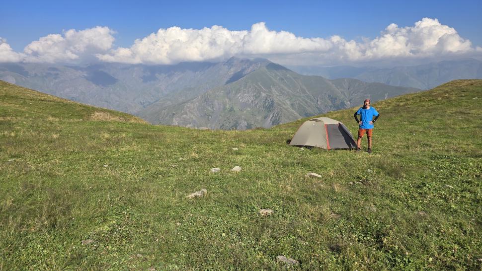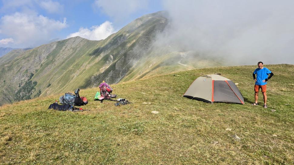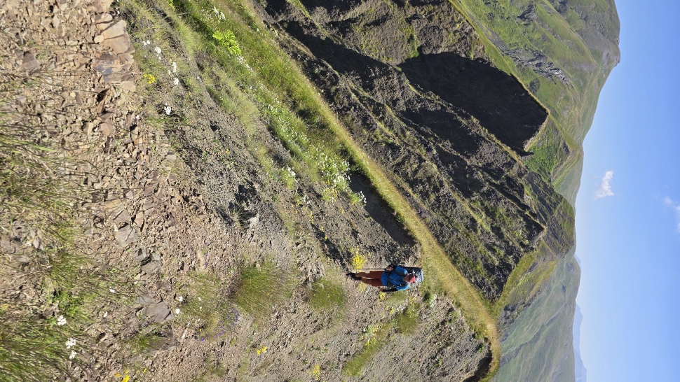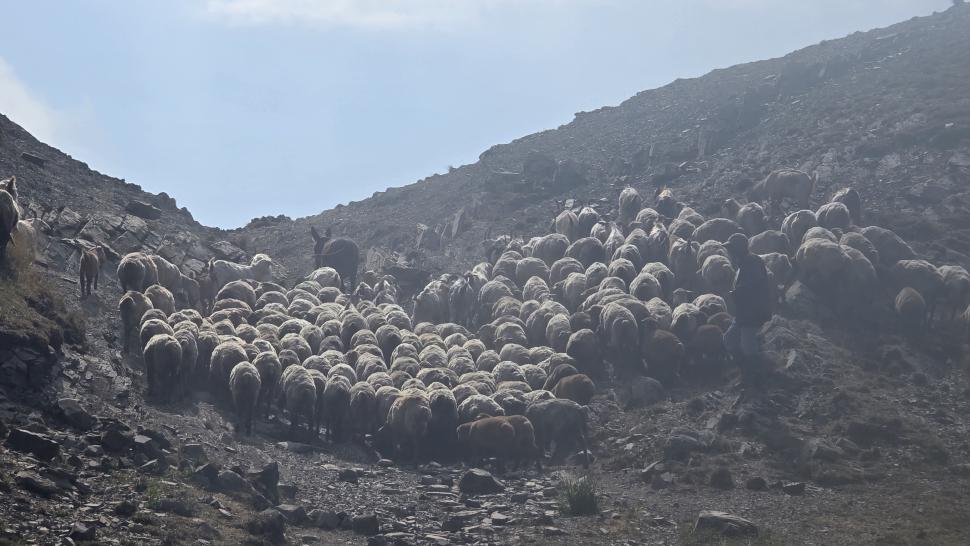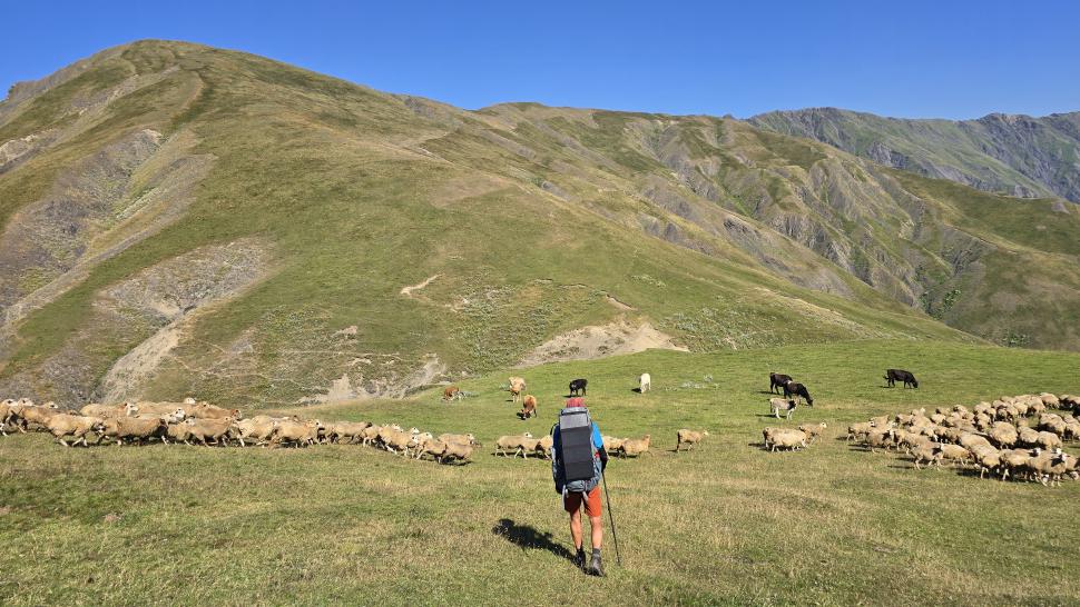 Friedlich und sonnig ist der Morgen mit grandiosem Blick auf die Berglandschaft, nachdem wir um 7 Uhr aus dem Zelt nur kurz Hundegebell gehört haben. Das Zelt muss trocknen, dann wandern wir über die Wiesen, meist auf dem Grat entlang. Die Herden treffen wir jeweils mit einem Hirten, eine sogar ohne Hunde. An einem Hang spricht uns ein junger Hirte an und warnt uns vor dem weiteren Weg in den Bezirk des weißen Flusses (oder doch Tees?). Seine vorgeschlagene Alternative hinunter ins Tal zu unserer Rechten mit einem Abschnitt auf russischem Gebiet kommt für uns aus mehreren Gründen nicht in Frage.