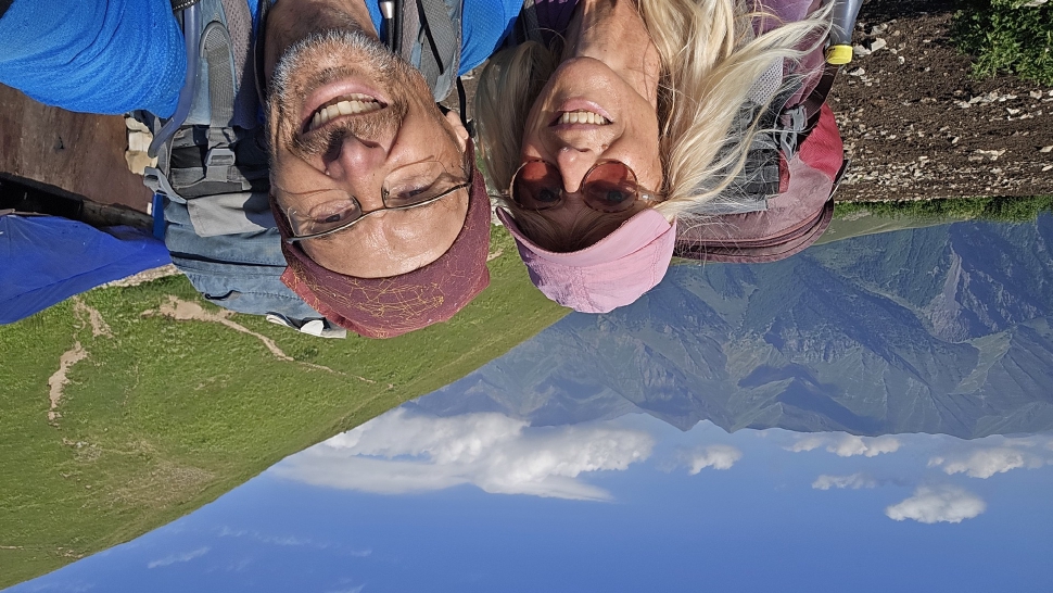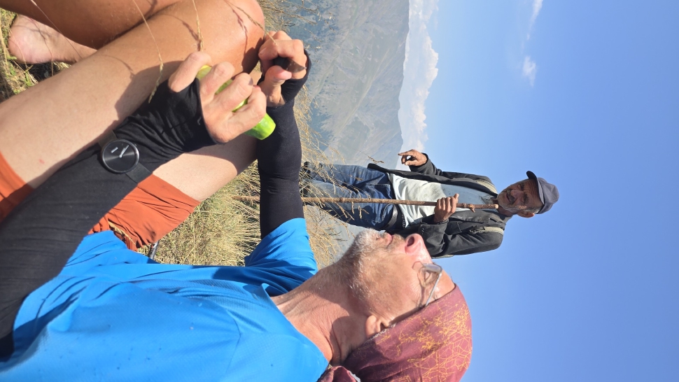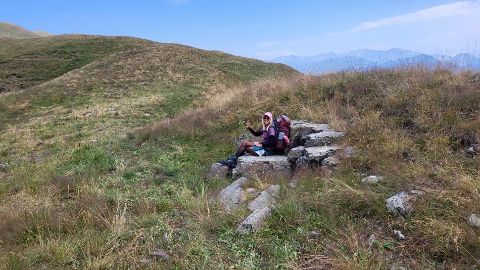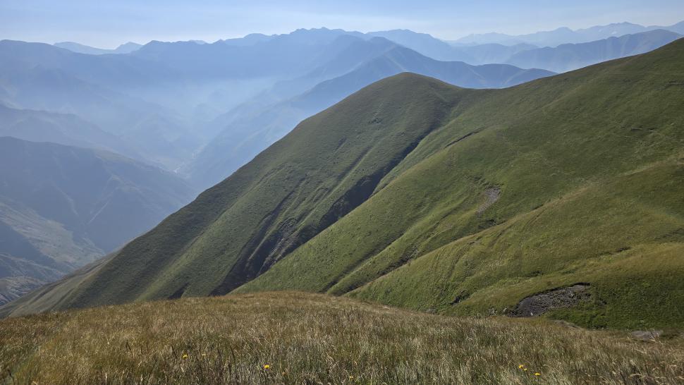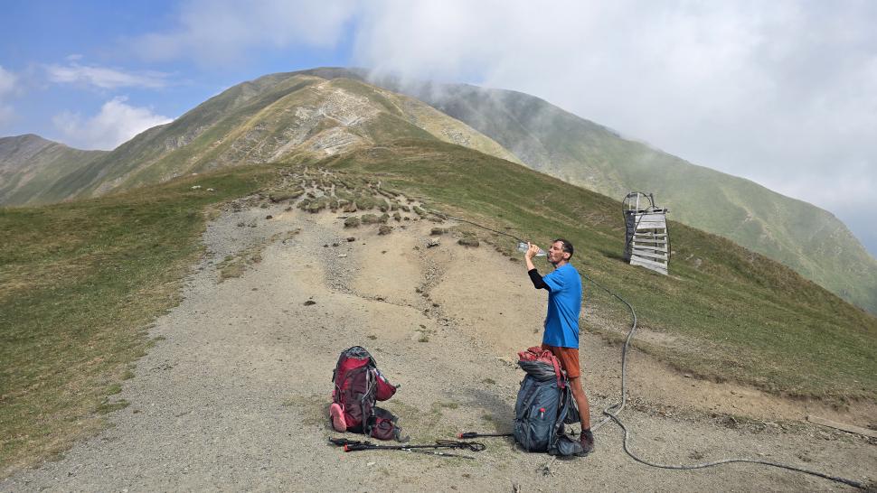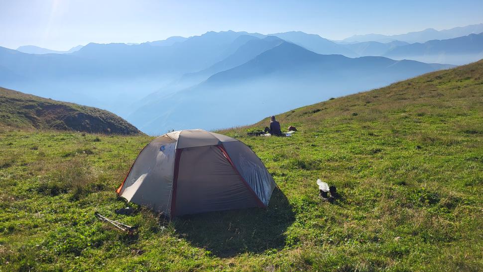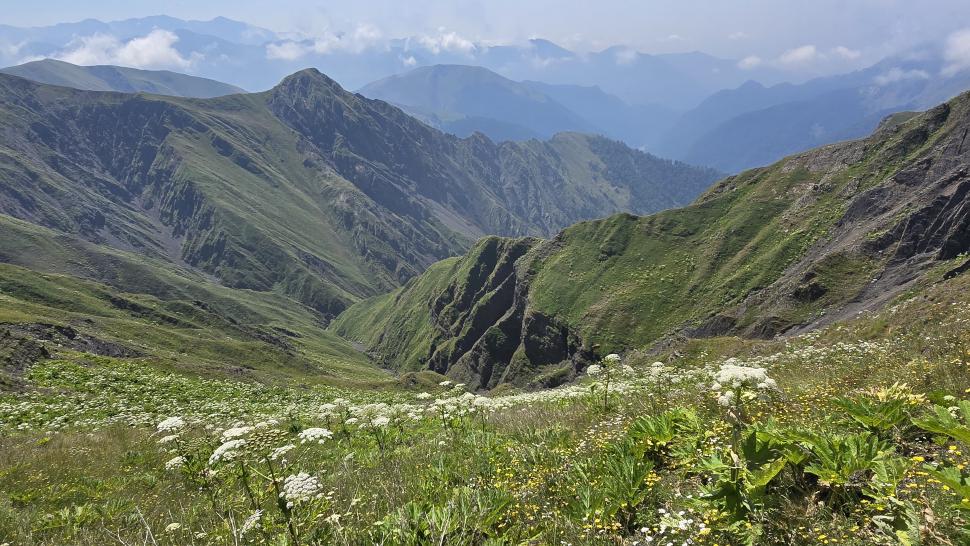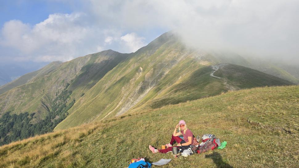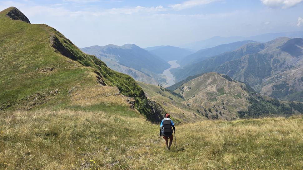 Friedlich und sonnig ist der Morgen mit grandiosem Blick auf die Berglandschaft, nachdem wir um 7 Uhr aus dem Zelt nur kurz Hundegebell gehört haben. Das Zelt muss trocknen, dann wandern wir über die Wiesen, meist auf dem Grat entlang. Die Herden treffen wir jeweils mit einem Hirten, eine sogar ohne Hunde. An einem Hang spricht uns ein junger Hirte an und warnt uns vor dem weiteren Weg in den Bezirk des weißen Flusses (oder doch Tees?). Seine vorgeschlagene Alternative hinunter ins Tal zu unserer Rechten mit einem Abschnitt auf russischem Gebiet kommt für uns aus mehreren Gründen nicht in Frage.