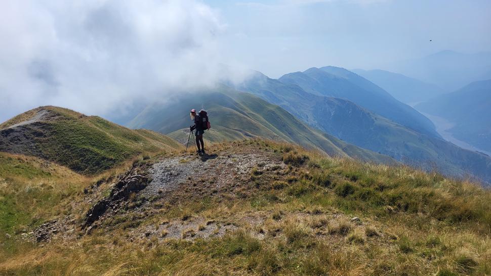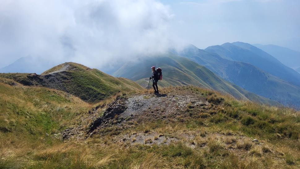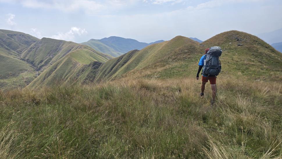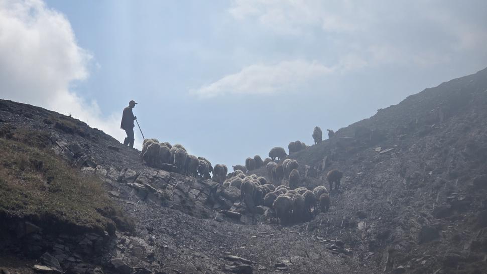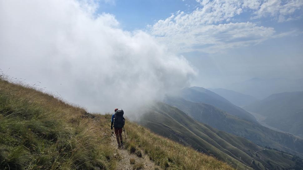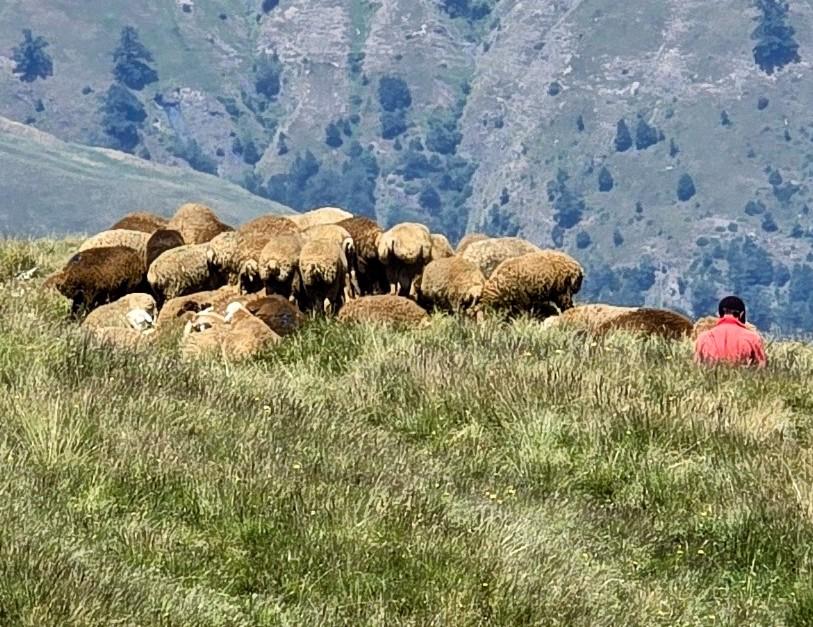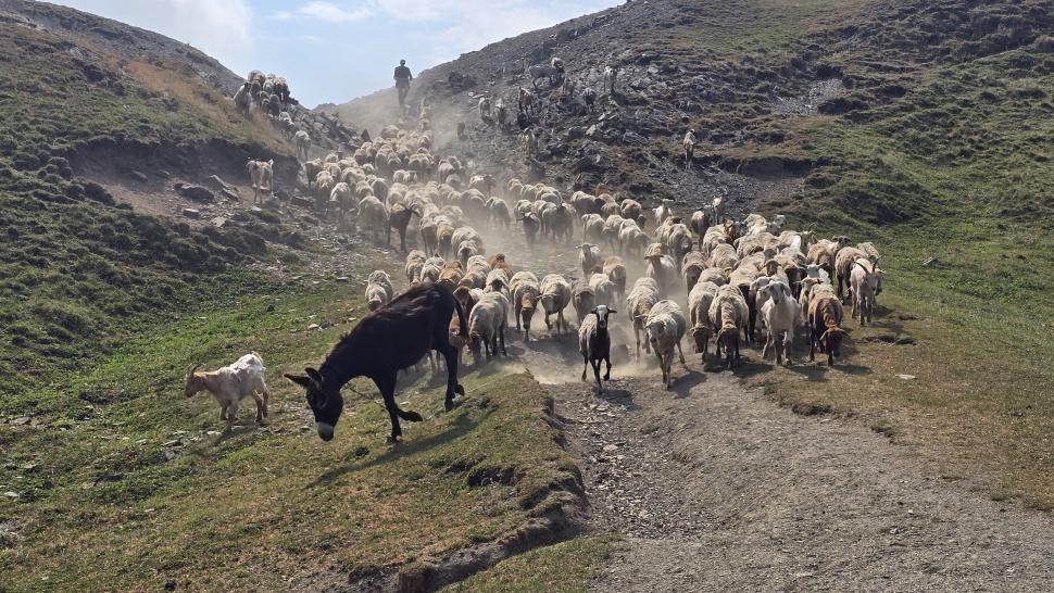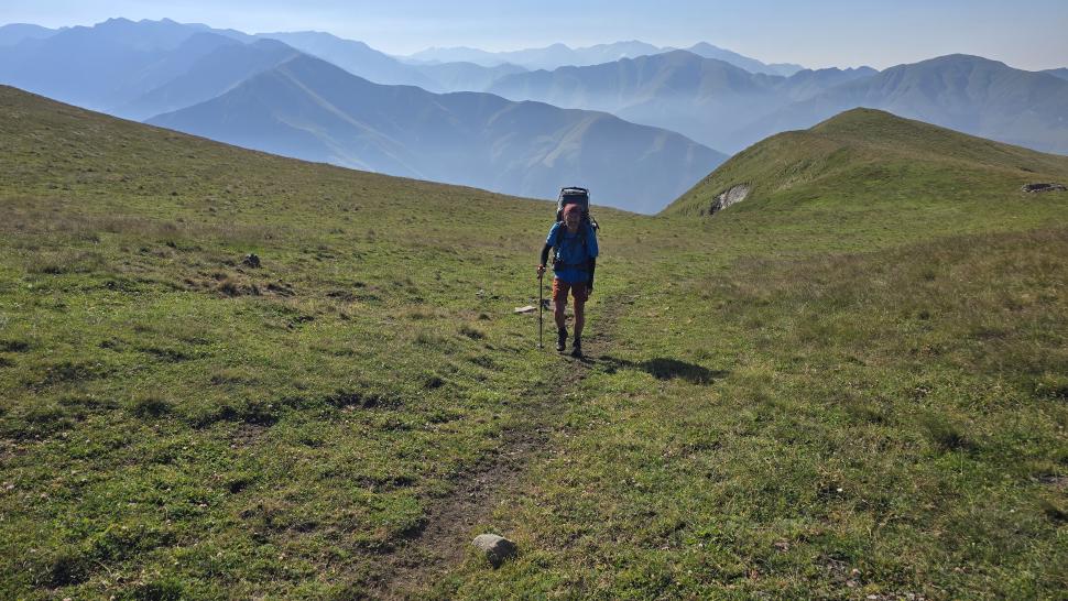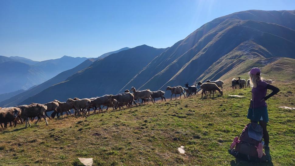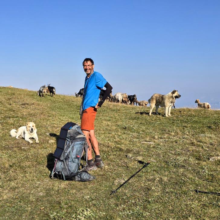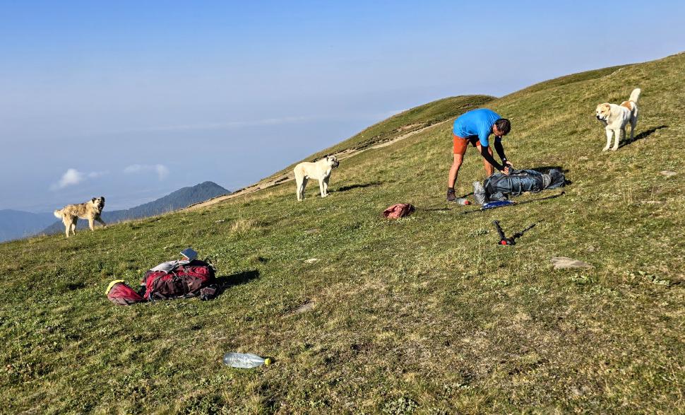 Um halb 7 Uhr werden wir von Hundegebell geweckt. Als wir etwas später aus dem Zelt kommen, ist es wieder ruhig und leer. Unser Frühstück bleibt ungestört, auch der Abbau, dann kommt die Herde mit den Hunden zurück. Wir gehen ein Stück unseres Weges gemeinsam, sind dann aber schneller. Die tolle Aussicht können wir noch eine Weile genießen, die wenigen Wolken sind unterhalb. Wir treffen noch einen Hirten, mit dem wir ein wenig austauschen, wie immer eher mit Gesten als mit Worten. Eine Einladung zum Tee in einem Shelter lehnen wir ab.