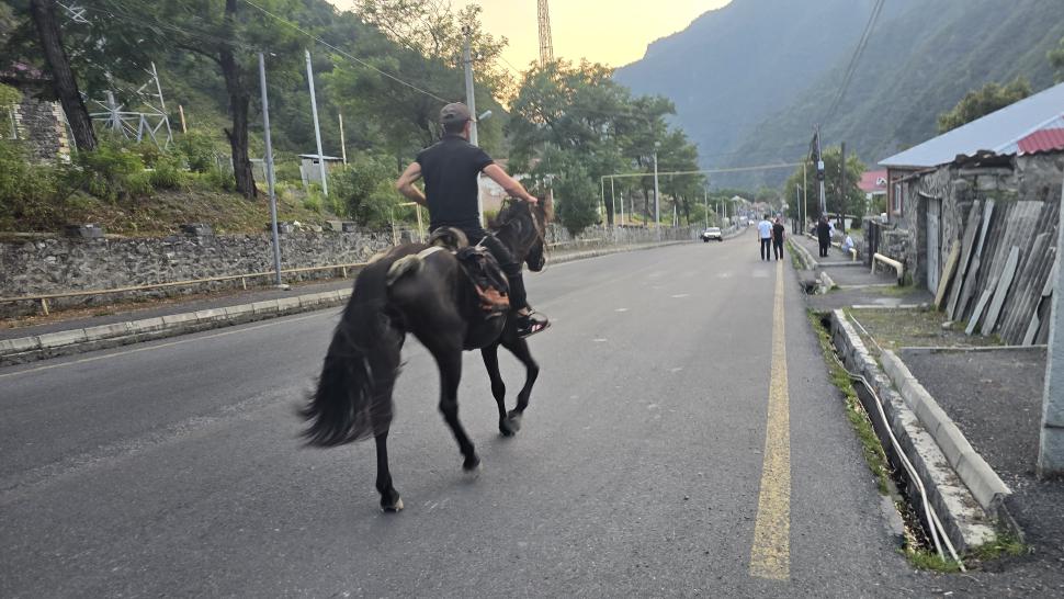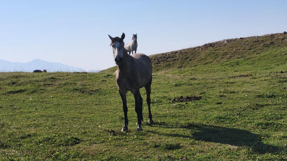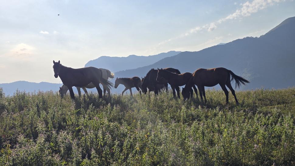An dem Hang queren wir weit hinüber, bevor es wieder steil bergauf geht. Oben ist wieder ein Camp. Es ist ruhig, wir sind froh und machen Selfies mit dem neuen Tal im Hintergrund. Doch das Pferd in ein wenig Entfernung wird unruhig, und schon bellen in unserer Nähe Hunde. Es sind 5 Hunde, doch sie werden zum Glück nicht angriffslustig. Wir können uns langsam aus dem Camp auf unseren weiteren Weg machen. Die Weidelandschaft hier ist sehr hübsch, der nächste Hirte hat seine Hunde im Griff. Eine Herde Pferde steht noch am Weg, dann beginnt der steile Abstieg nach Ilisu. Am Fort oberhalb des Ortes schauen wir uns um, sprechen mit einem Azerbaijanischen Touristenpaar und kommen dann ins Dorf. Ein Gästehaus gibt es offenbar nicht mehr, nur eine größere Hotelanlage am Rand des Dorfes oberhalb. Also kaufen wir noch etwas ein und suchen uns am Fluss Kürmükcay im trockenen Teil des Flussbetts einen sichtgeschützten Zeltplatz. Hier atmen wir tief durch nach dem anstrengenden, aufreibenden Tag in dieser eigentlich unruhigen Umgebung, waschen uns im Fluss und kochen uns noch etwas Leckeres.