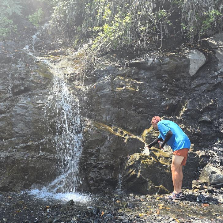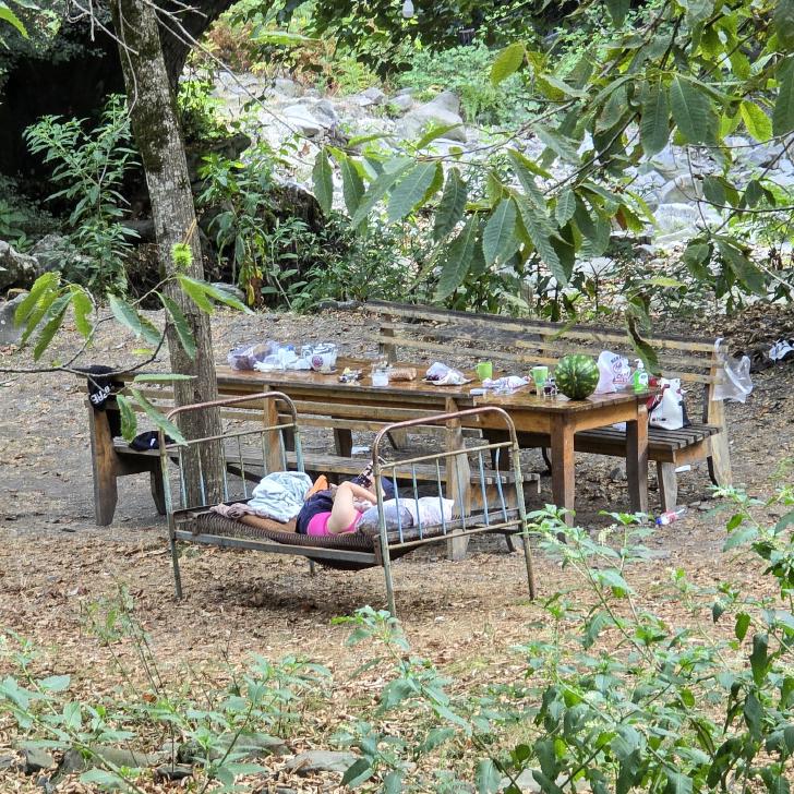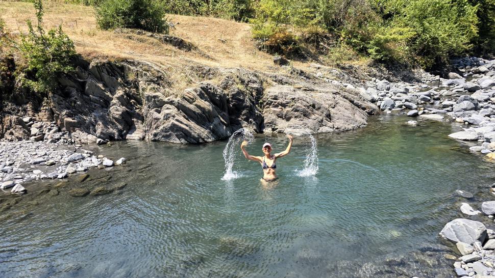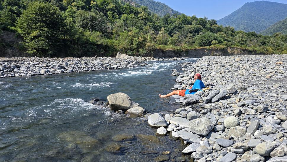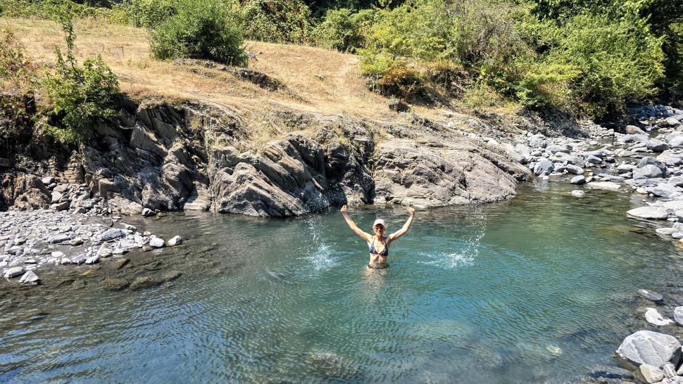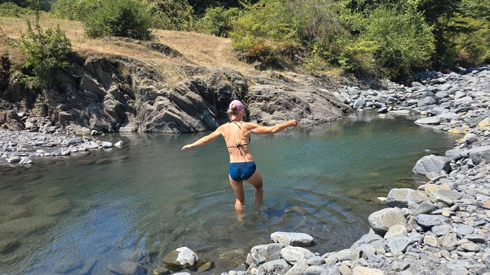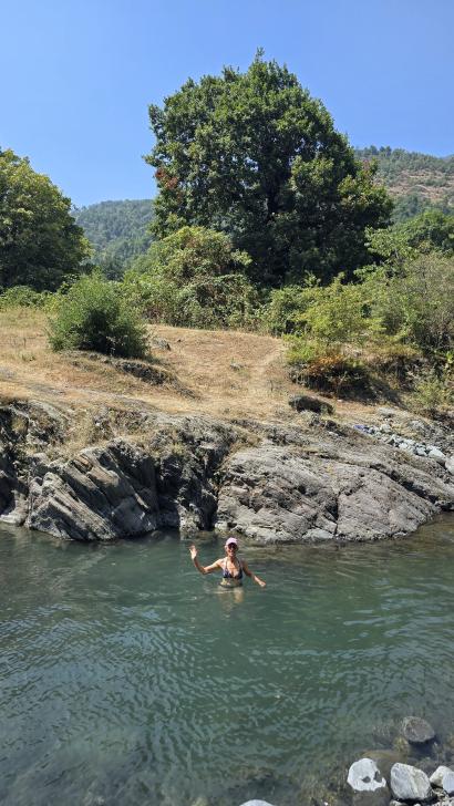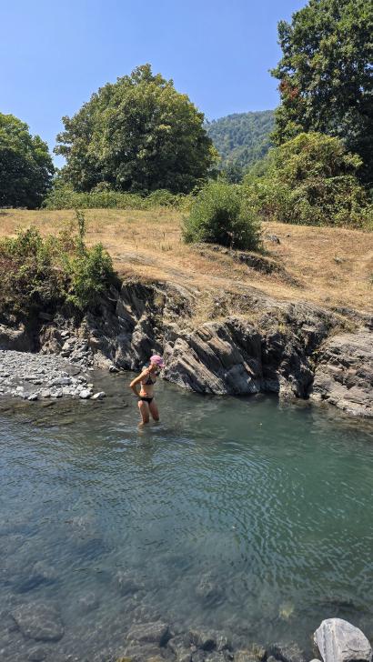 Der Fluss und der Ort auf dem anderen Ufer heißen Katex. Hier gibt es laut Reiseführer einen sehenswerten Wasserfall. Am Campingplatz lassen wir uns Bier abfüllen und kaufen Brot. Der Wasserfall ist gesperrt. Hm, wir gehen trotzdem auf den Weg dorthin, durch den Fluss und auf der anderen Seite am Ufer entlang und kommen zu einem Sperrposten an einer Schranke, der tatsächlich mit zwei jungen Männern besetzt ist. Sonst hätten wir vermutlich noch geschaut, warum der Weg gesperrt ist. Also gehen wir zurück zu einem schönen Pool in einem Seitenarm des Katex Flusses. Hier gehen auch zwei junge Männer in Tarnkleidung herum. Sie haben Brombeeren gepflückt und wollen nun im Pool baden. Also suchen wir für diese Zeit wieder flussaufwärts einen ruhigen Platz. Da kommen von der großen Wiese oberhalb einige Soldaten auf uns zu und sind ganz aufgeregt, dass wir hier nicht weitergehen dürfen. Wir verstehen nicht, warum, auch ihre Aufregung nicht, zumal weiter hinten ja noch der Sperrposten kommt. Aber zum Diskutieren sind sie ganz und gar nicht bereit, also ziehen wir uns wieder zurück. Dort sind die beiden von vorhin nun auch aufgeregt, aber nicht so sehr. Nun können wir im Pool baden und die Kühle hier genießen, weil es sehr heiß und sonnig ist.