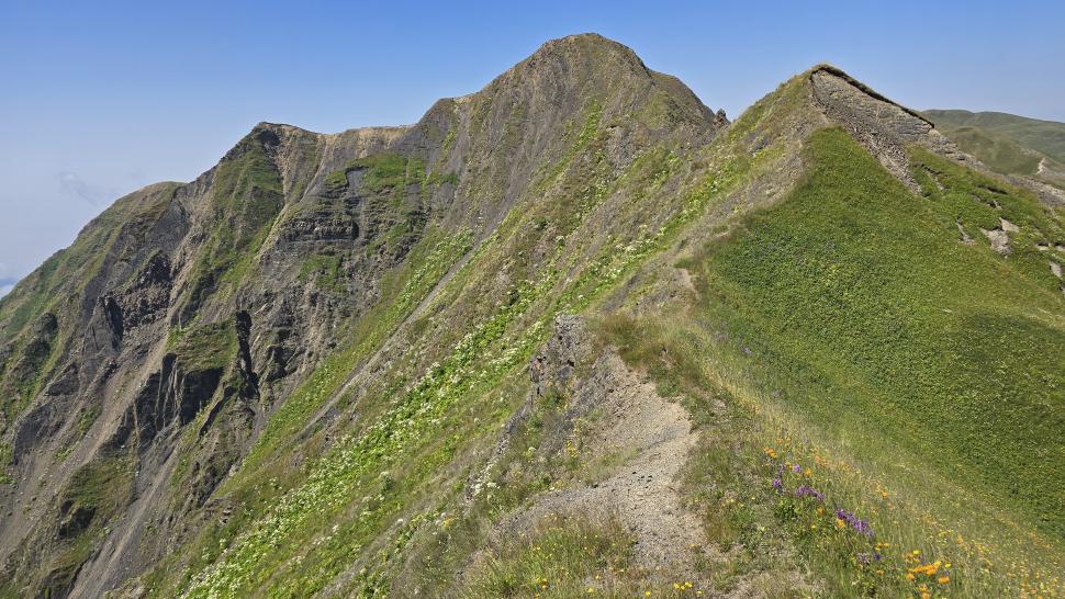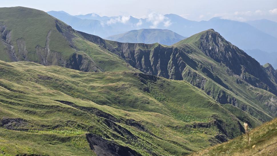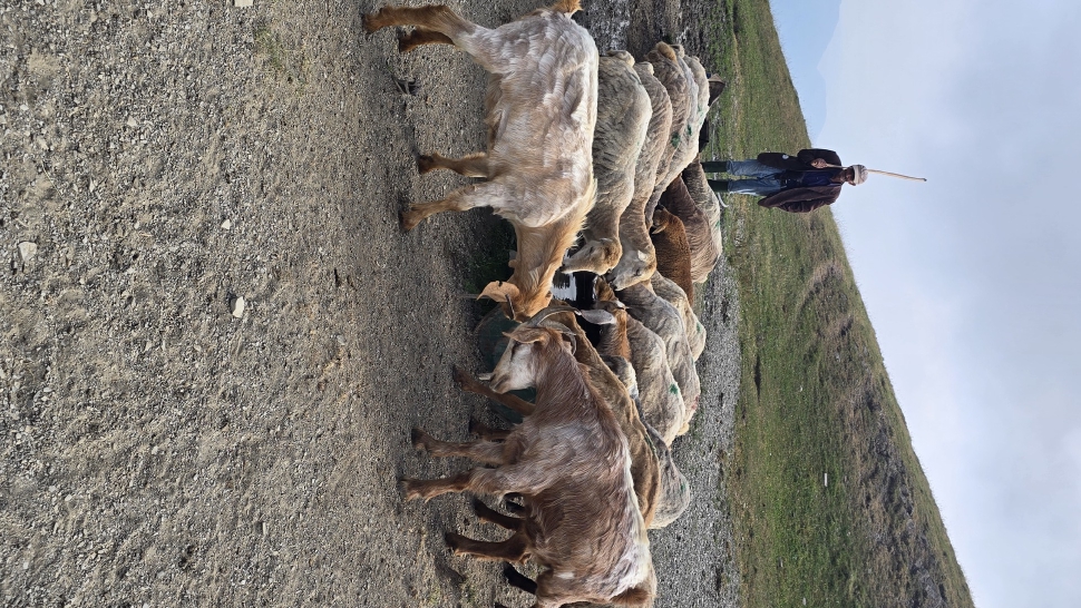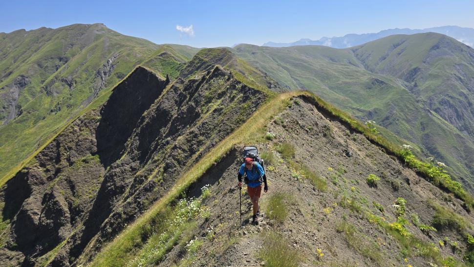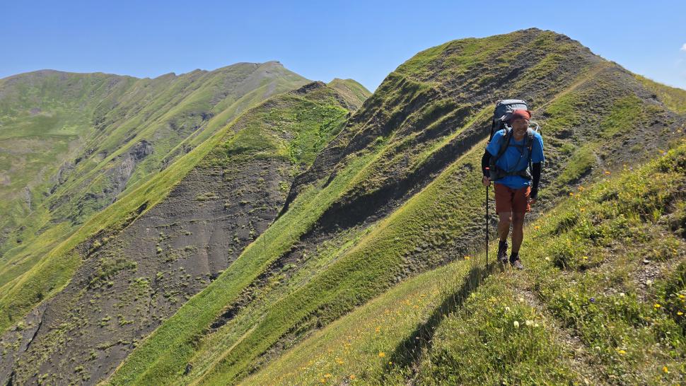 Der weitere Weg wird kniffliger; das sah man schon bei unserer Diskussion. Aber die erodierten Abschnitte sind sehr kurz und zügig ohne Unsicherheit gemeistert. Der Ausblick hier oben entlang unseres schmalen Gratweges und in die Täler ist unvergleichlich. Während unserer Picnicpause kommt ein Hirte mit seiner Herde vorbei und gesellt sich zu uns. Wir bekommen Ayran und eine Gurke, beides ein erfrischender Genuss. Bremsen mit knallgrünen Augen gibt es hier, und ein Raubvogel zieht seine Kreise über uns.