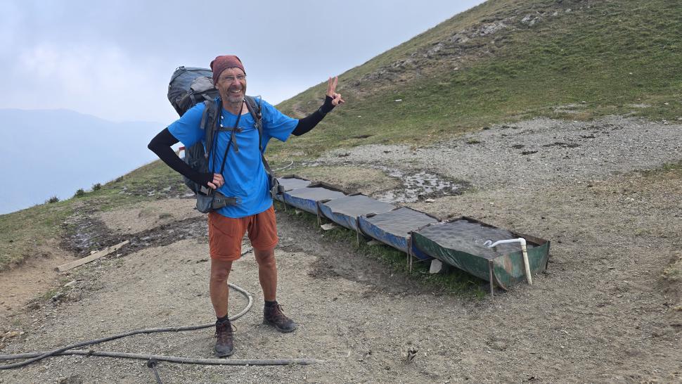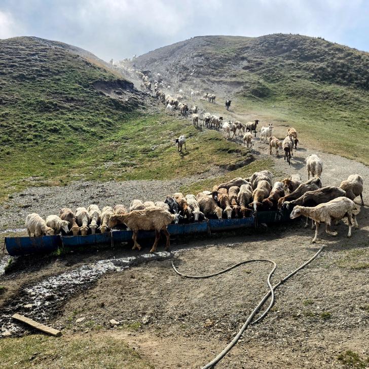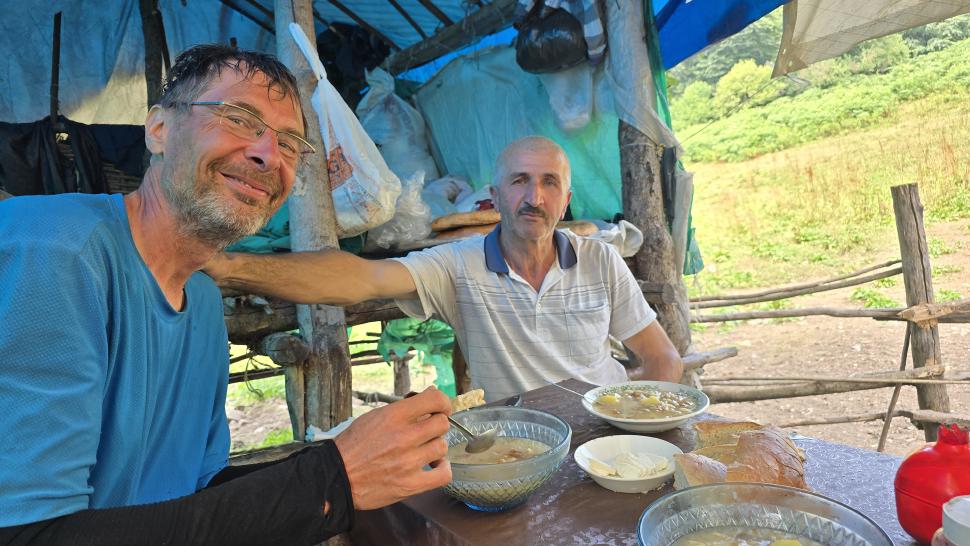 Auf 1900 m Höhe gibt es wieder fließendes Wasser, sehr schön. Wenig später kommen wir an ein Hirtencamp, drei Hirten und 5 Hunde. Wir werden zu Tee, Brot und Käse eingeladen, bekommen unseren Wasservorrat komplett gefüllt und viel Brot und Käse für den Weg. Eine Stunde steigen wir auf Wiesen weiter auf 2520 m. Hier suchen wir uns einen Zeltplatz; wir sind nun oberhalb von Saribash. Die Sonne scheint, fürs Kochen müssen wir in einen kleinen Shelter gehen, weil hier oben wahrscheinlich immer Wind weht. Auch heute Nacht bietet sich wieder das 100 Sterne Hotel.