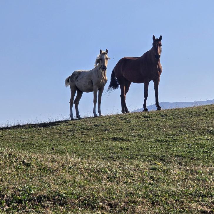 Der Grat ist nun nicht mehr so schmal. In einem Sattel ist tatsächlich eine Wasserquelle wie auf der Karte verzeichnet. Das Wasser fließt frisch in eine Trogkette. Wir füllen unsere Vorräte wieder komplett auf und trinken auch genüsslich. Gerade als wir fertig sind, kommt eine Herde von der anderen Seite. Das gezielte Getummel ist ein faszinierendes Schauspiel. Dann sind sie schon weitergezogen; der Hirte war kaum zu bemerken. 100 m weiter finden wir einen guten Zeltplatz. So kehren wir zum Frischmachen an die Wasserstelle zurück und sind gerade fertig, als die nächste Herde kommt. Der Hirte ist wieder sehr gelassen, aber sein Hund bellt ausgiebig. Nun ziehen ein paar Wolken vor die Sonne, aber beim und nach dem Kochen kehrt die orange Abendsonne zurück. Ein paar Pferde mit Glöckchen kommen noch an die Tröge, dann sinken wir glücklich in unseren Schlafsack.