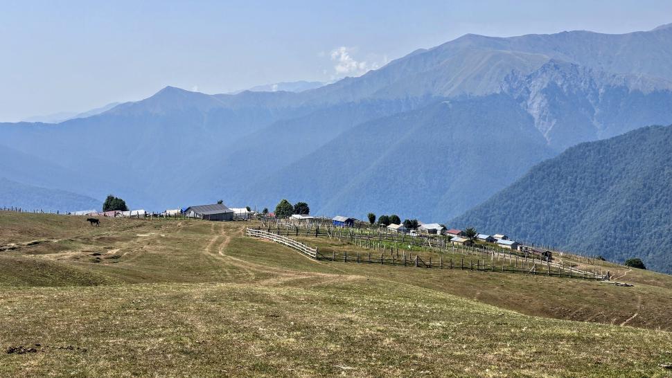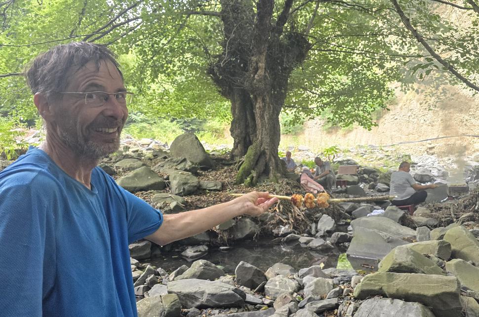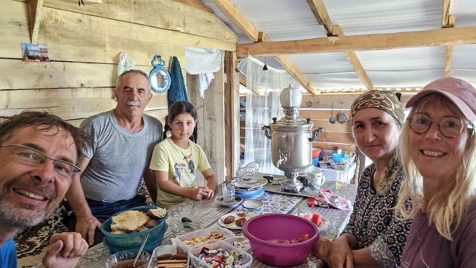 Der Weg ist deutlich und gut markiert. Er führt immerzu aufwärts von 550 m auf 1850 m, aber bleibt langweilig, bis er aus dem Wald führt. Die Weidelandschaft ist nicht so spektakulär wie zwischen Ilisu und Mamrux, aber die Siedlung Shamilkova mit ihren Häusern und Zäunen ist in dieser Höhe etwas Besonderes. Magomed mit Frau und Enkelin laden uns zu Tee, Melone, Brot und Syr (Käse) ein, sehr lecker, mit einigem Austausch auch zur Karte und Fotos. Der Abschnitt auf den Wiesen ist nicht sehr lang, eine Quelle fließt nicht, ist nur grünfeucht, dann geht es steil wieder abwärts in den Wald hinein, aber sehr gut begehbar. Unten nahe Car grillt eine Gruppe älterer Männer. Sie bieten uns sofort einen ihrer Hähnchenspieße an, wieder sehr lecker und völlig überraschend.