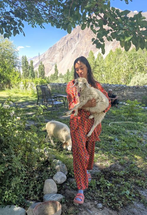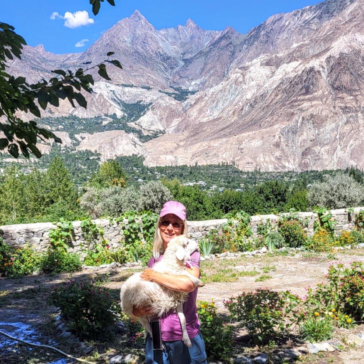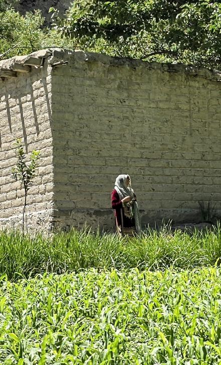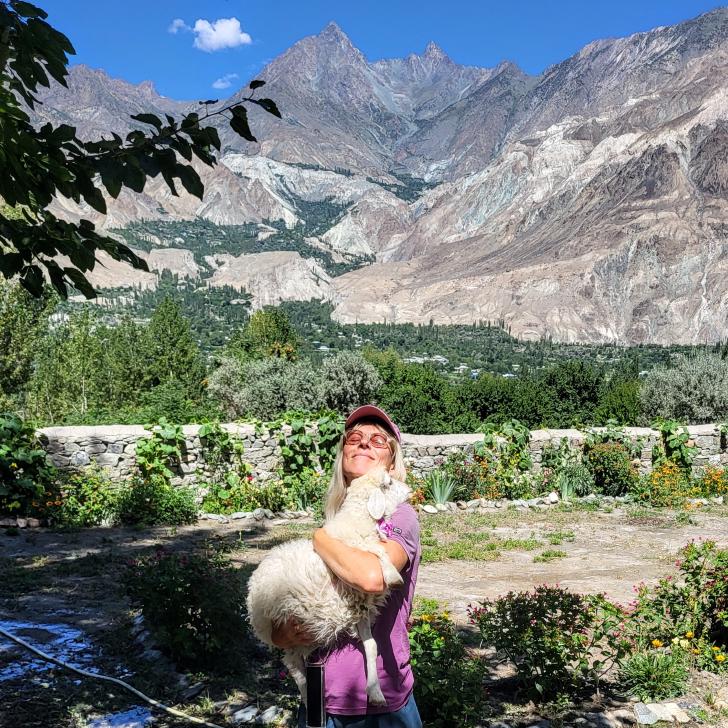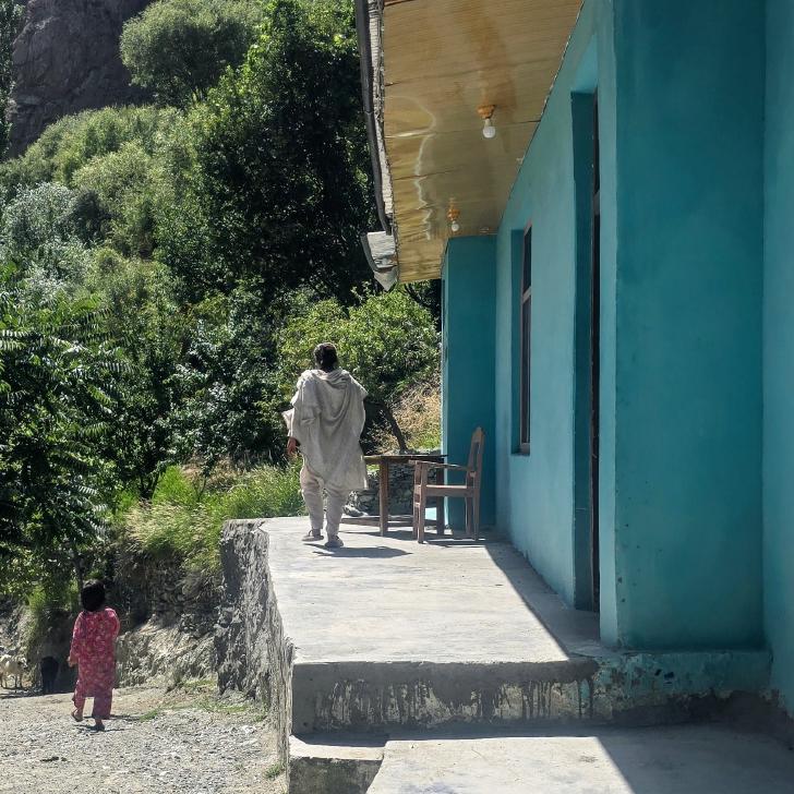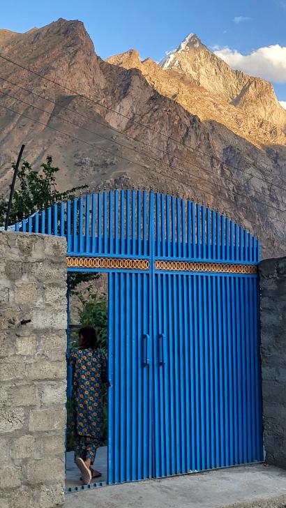 Auf der Karte liegt Chatorkhand rechts unten mitten in den Markierungen. Hier wachen wir bei Sonnenschein auf und blicken mit Staunen auf das gegenüberliegende Daeen Tal. Wie Alex nimmt auch Antje ein Schaf des Guesthouse auf den Arm. Mit den Gastgebern Alex und Sanaa sowie Hakim frühstücken wir. In dieser Besetzung fahren wir im Jeep über die Ishkoman Brücke ins Daeen Tal.