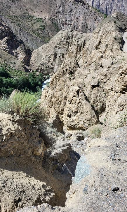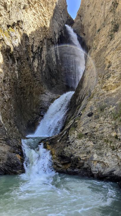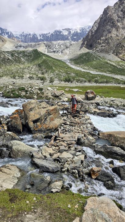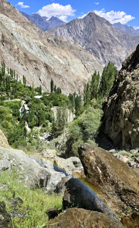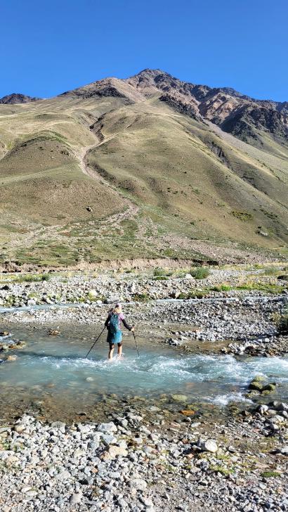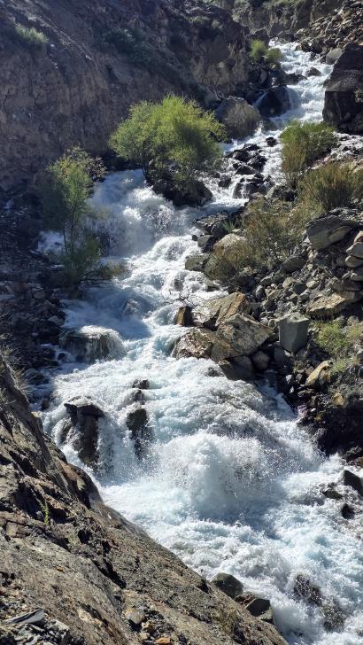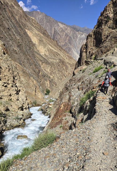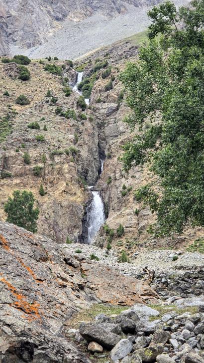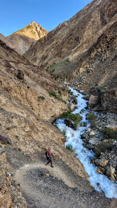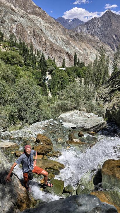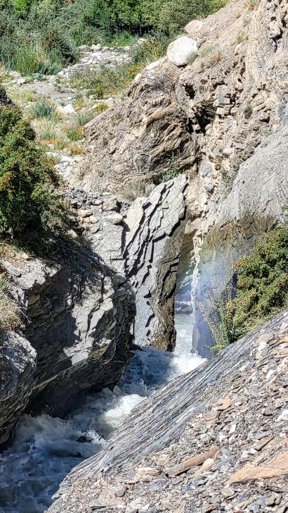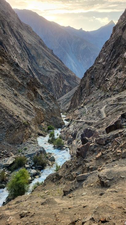 Der Abstieg nach Darkut beginnt früh und ist wunderschön. Zunächst furten wir durch den Gartanz Fluss, dann geht es in seiner Schlucht abwärts. Sprudelndes Wasser, Murmeltiere, Erdpyramiden und tolle Berge ringsum. Wir genießen, dass wir ein wenig Abstand zu unserer Begleitergruppe haben. Um 11 Uhr gelangen wir nach Darkut.