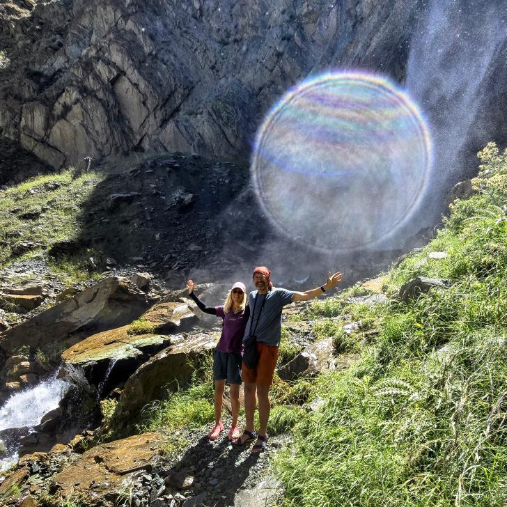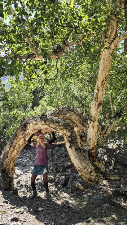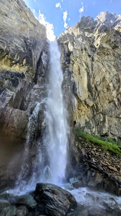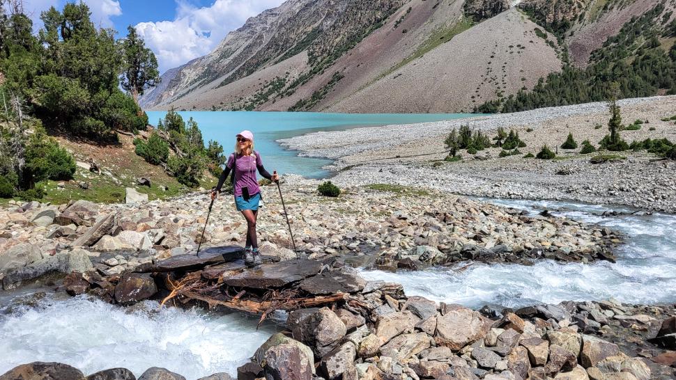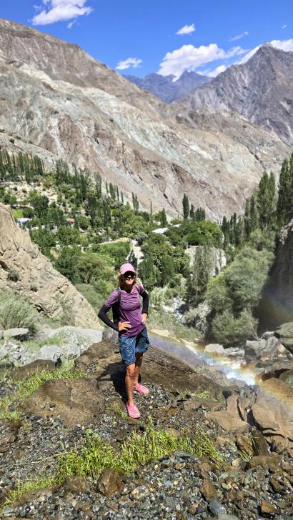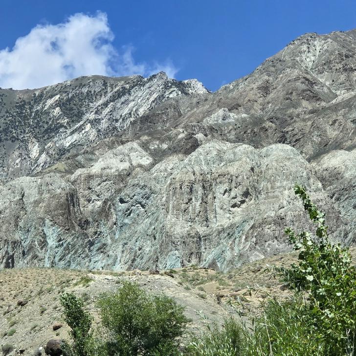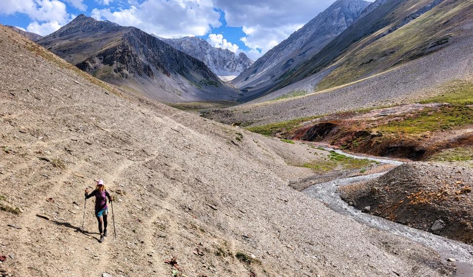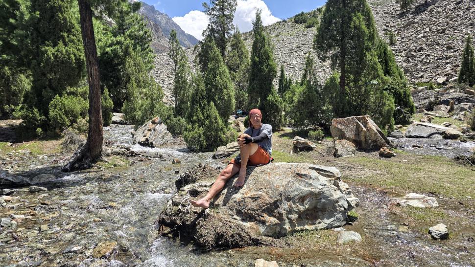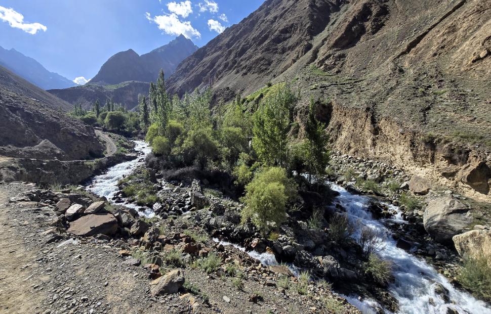Der Abstieg nach Darkut beginnt früh und ist wunderschön. Zunächst furten wir durch den Gartanz Fluss, dann geht es in seiner Schlucht abwärts. Sprudelndes Wasser, Murmeltiere, Erdpyramiden und tolle Berge ringsum. Wir genießen, dass wir ein wenig Abstand zu unserer Begleitergruppe haben. Um 11 Uhr gelangen wir nach Darkut.
