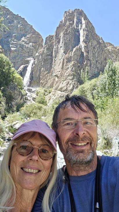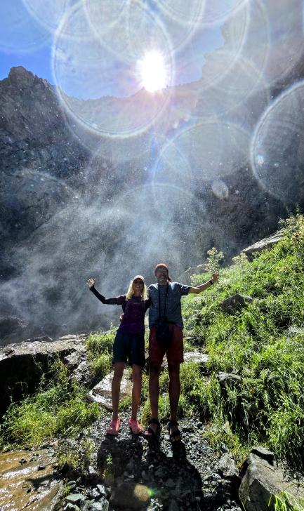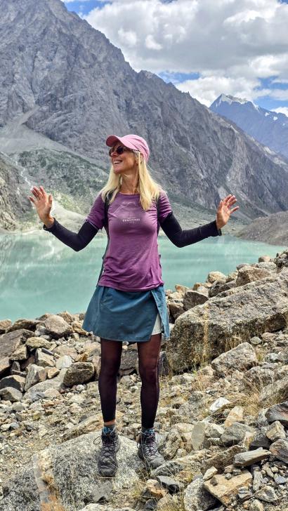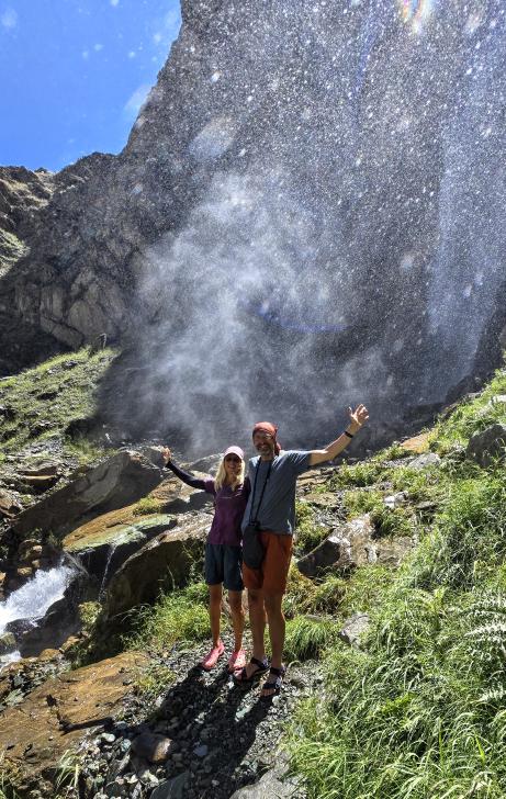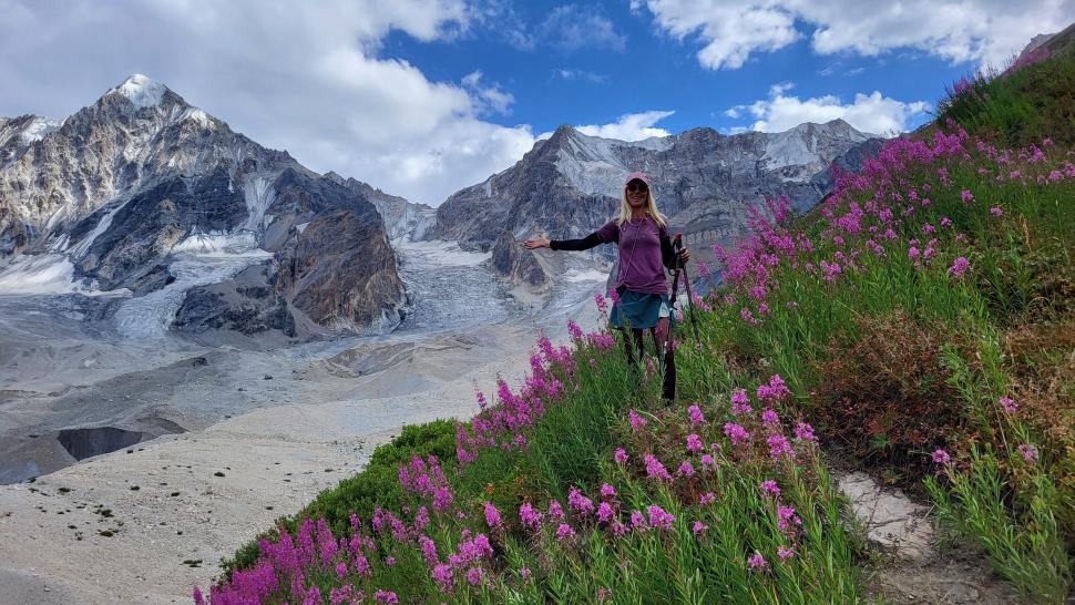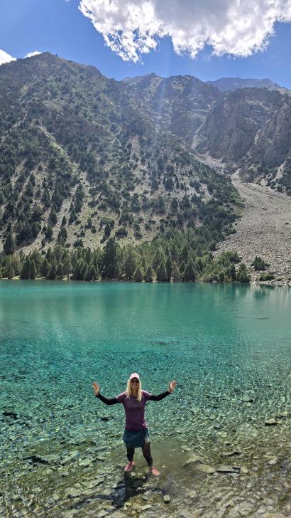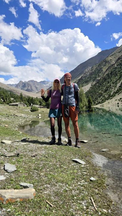 Der Morgen in dieser schönen Bergwelt ist sonnig, Antje nimmt ein kaltes Bad. Gemeinsam mit allen gehen wir nach dem Frühstück zur anderen Seite des Sees. Hier sind die Gletscher näher und das Tal nach unten weit und übersichtlich. Die kleine Siedlung hier ist tatsächlich bewohnt.