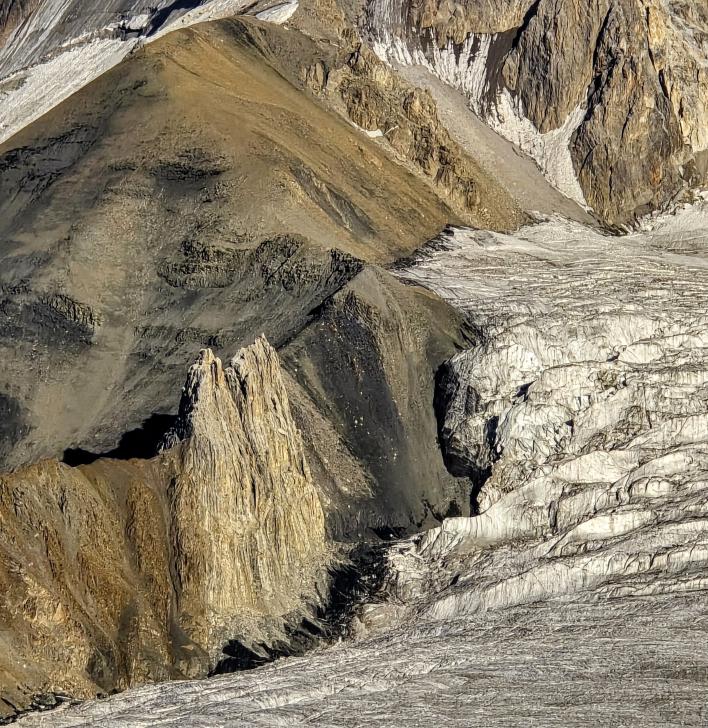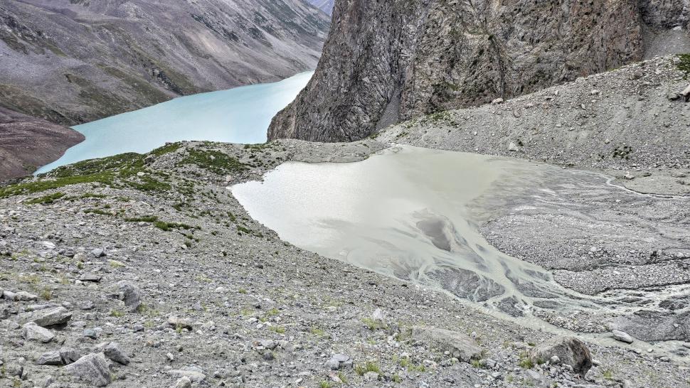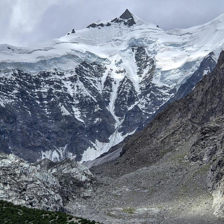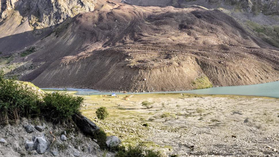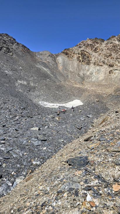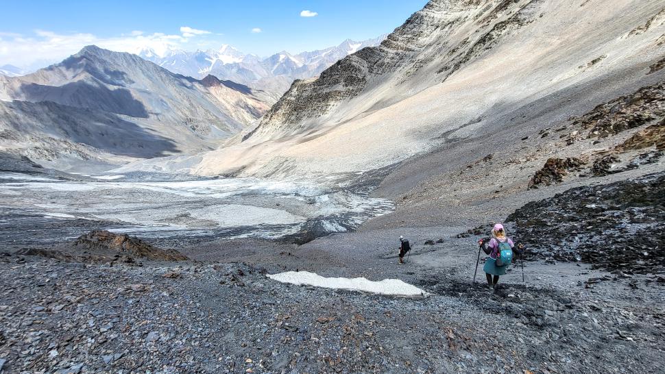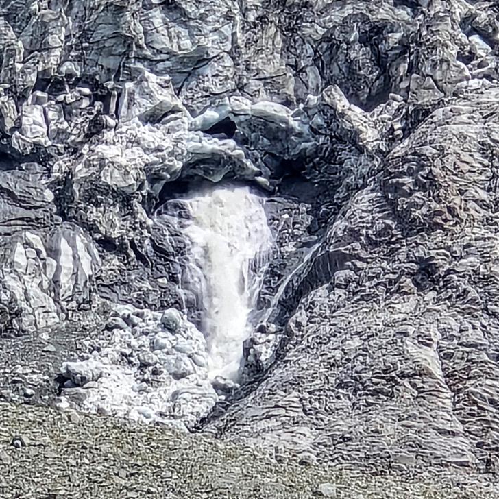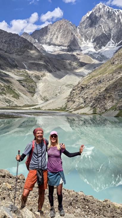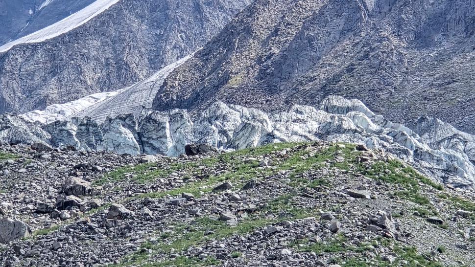 Im Lager der Italiener ist gerade nicht viel los. Wir suchen trotzdem erst in einiger Entfernung unsere Zeltplätze. Hier sind nicht so viele gerade Flächen, aber es reicht. Nach dem Fritten-Lunch gehen wir vom See noch aufwärts in Richtung des großen Gletschers. Das sind nochmal knapp 250 Höhenmeter und teilweise sehr mühsam, aber von hier ist der Ausblick auf den Gletscher toll und der kleine Gletschersee unterhalb ist ein milchig brauner Kontrast zum milchig blauen Atar See. Am Gletscher-Tor bricht eine größere Eismasse ab und stürzt und fließt den Fluss hinab - ein tolles Schauspiel - und gleich noch ein Abbruch.