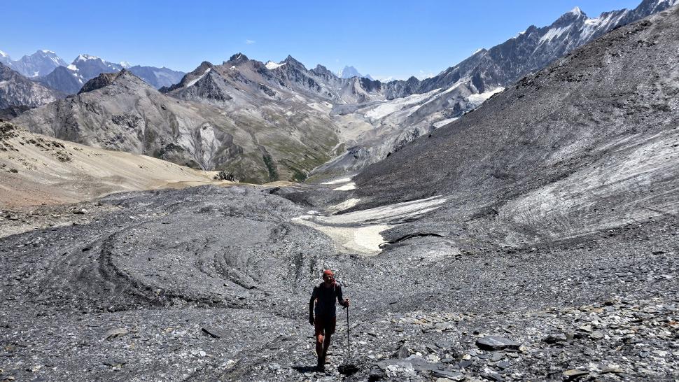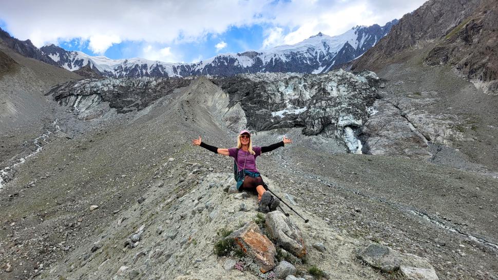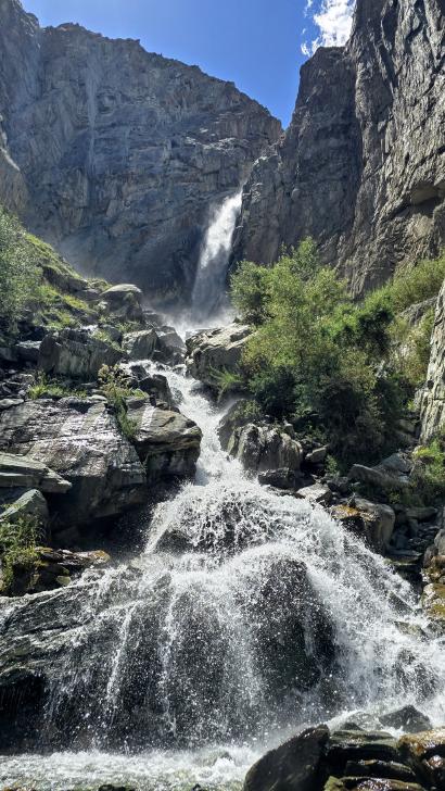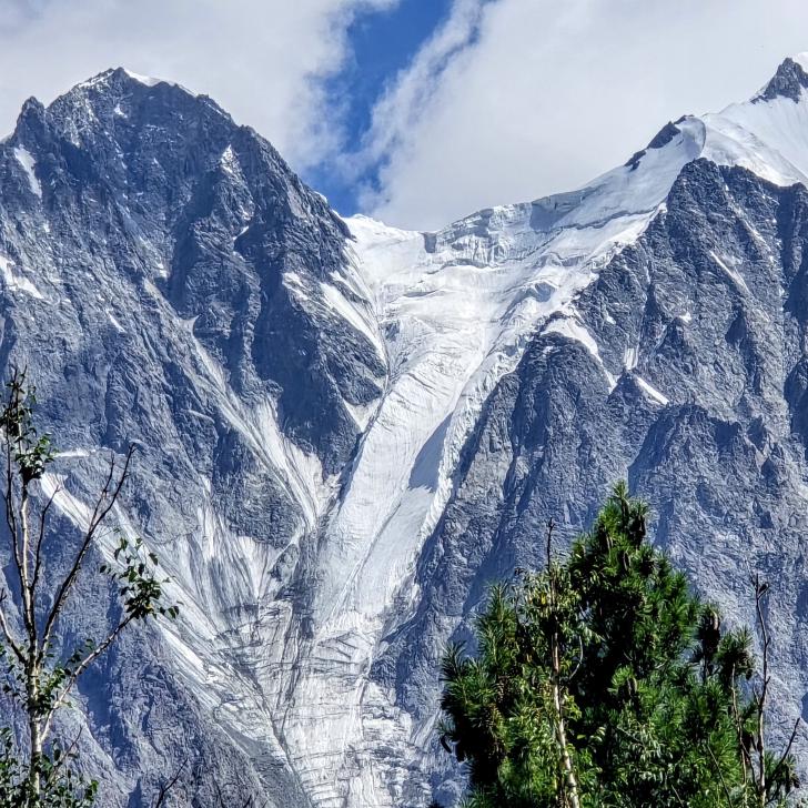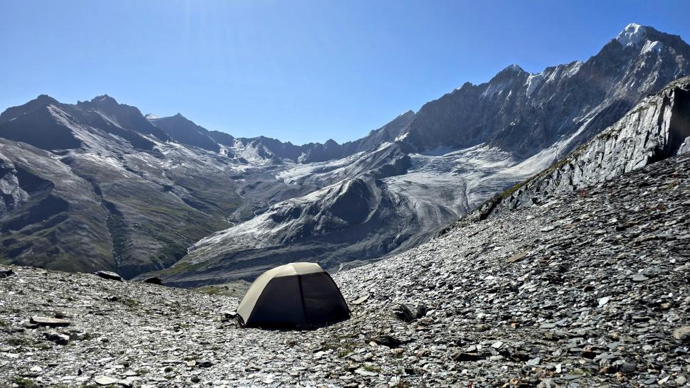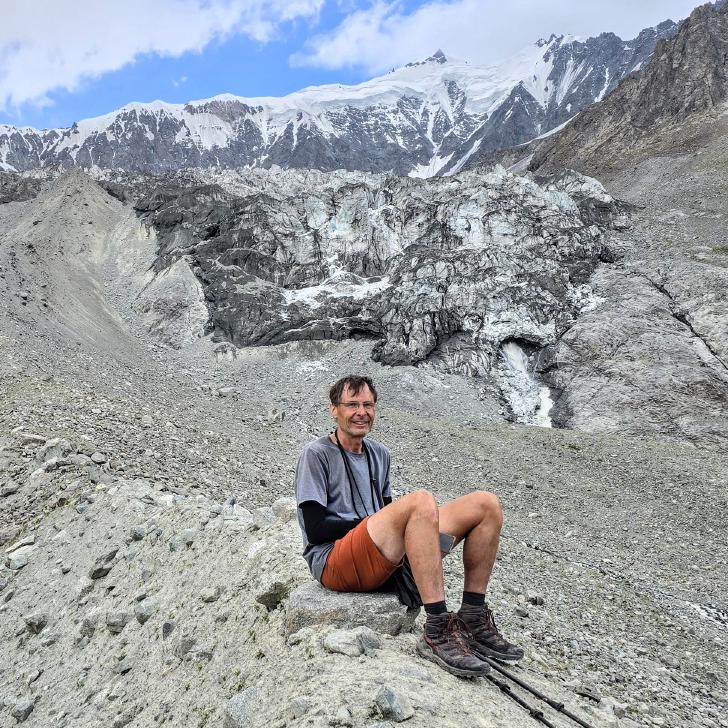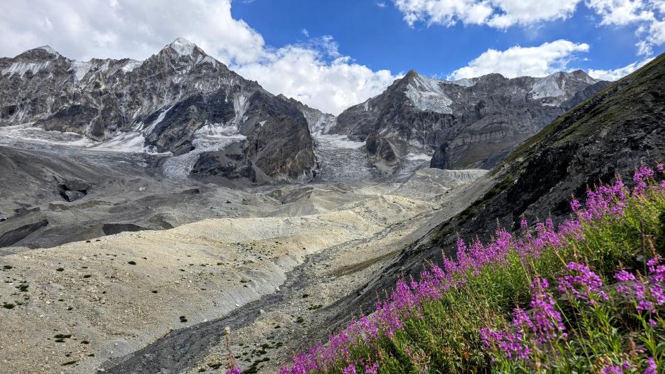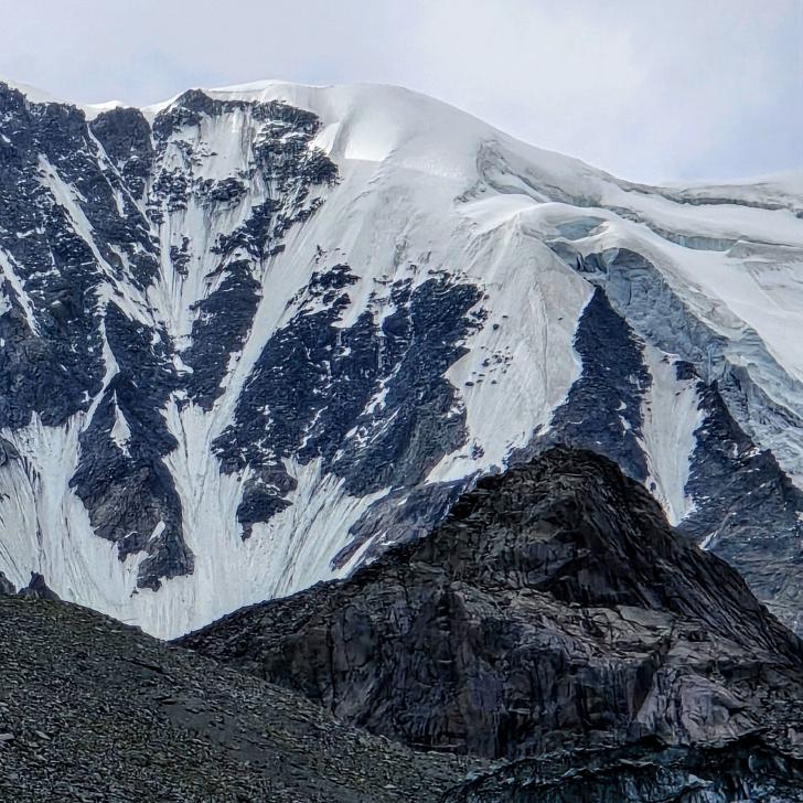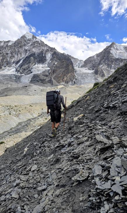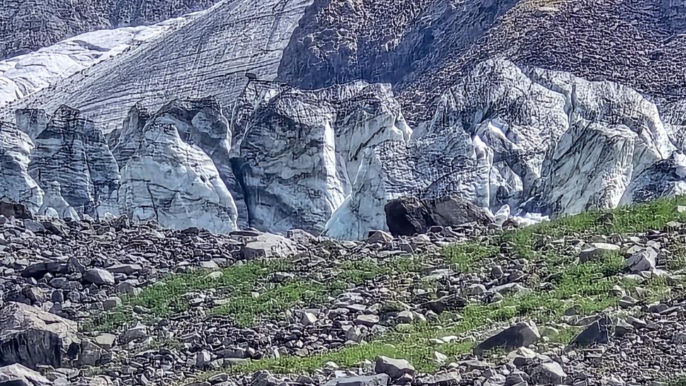 Im Lager der Italiener ist gerade nicht viel los. Wir suchen trotzdem erst in einiger Entfernung unsere Zeltplätze. Hier sind nicht so viele gerade Flächen, aber es reicht. Nach dem Fritten-Lunch gehen wir vom See noch aufwärts in Richtung des großen Gletschers. Das sind nochmal knapp 250 Höhenmeter und teilweise sehr mühsam, aber von hier ist der Ausblick auf den Gletscher toll und der kleine Gletschersee unterhalb ist ein milchig brauner Kontrast zum milchig blauen Atar See. Am Gletscher-Tor bricht eine größere Eismasse ab und stürzt und fließt den Fluss hinab - ein tolles Schauspiel - und gleich noch ein Abbruch.