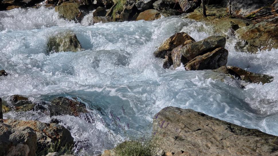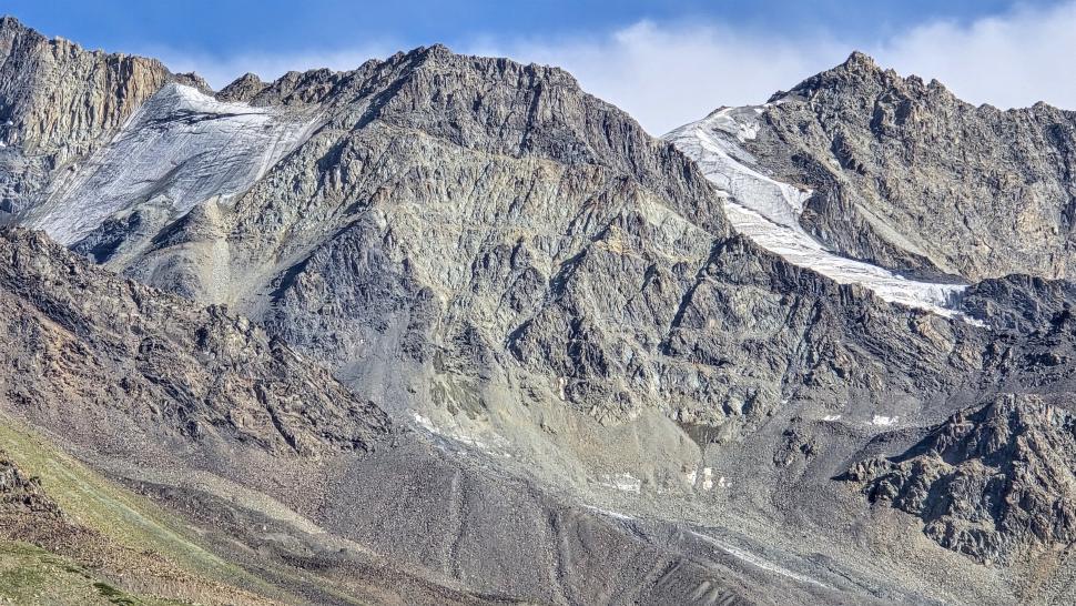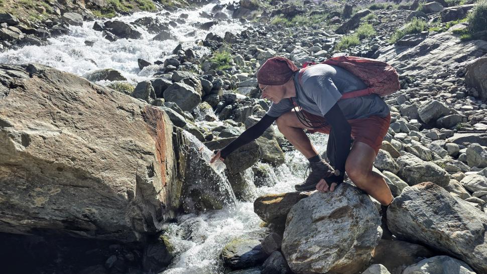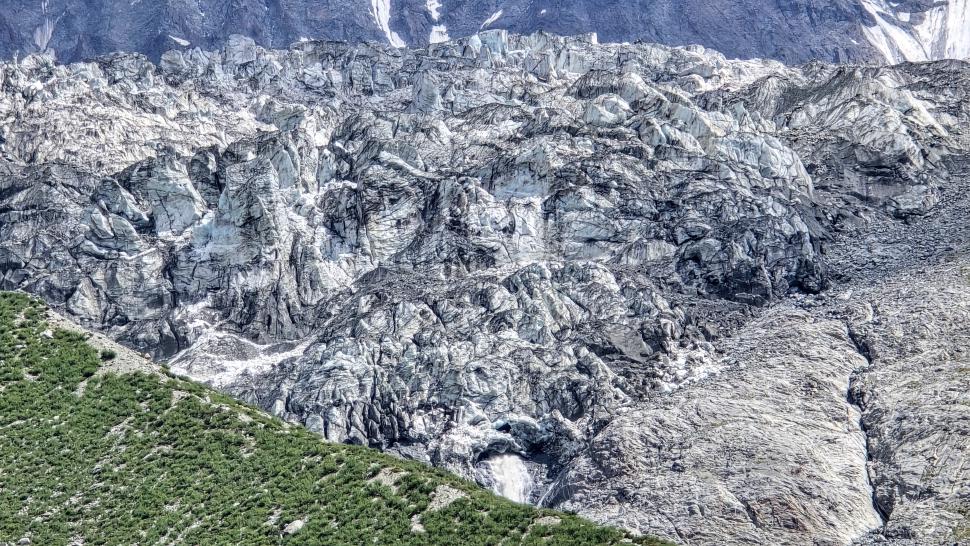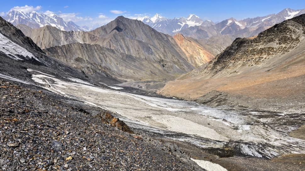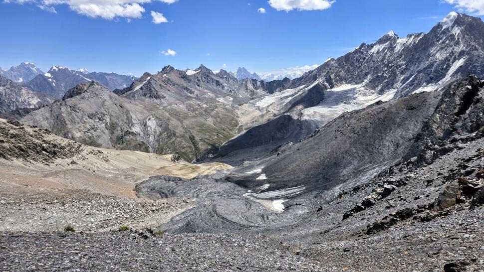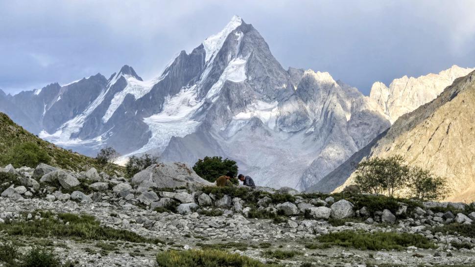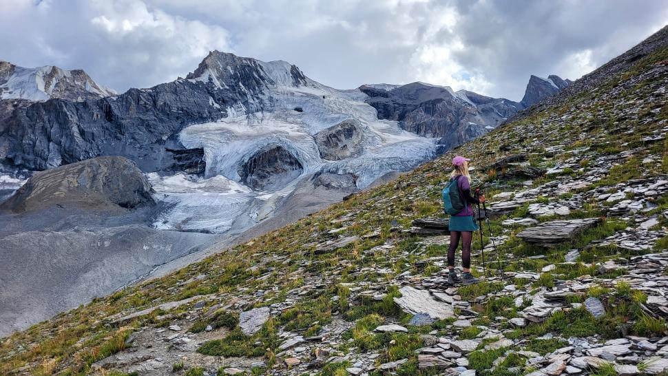 Im Lager der Italiener ist gerade nicht viel los. Wir suchen trotzdem erst in einiger Entfernung unsere Zeltplätze. Hier sind nicht so viele gerade Flächen, aber es reicht. Nach dem Fritten-Lunch gehen wir vom See noch aufwärts in Richtung des großen Gletschers. Das sind nochmal knapp 250 Höhenmeter und teilweise sehr mühsam, aber von hier ist der Ausblick auf den Gletscher toll und der kleine Gletschersee unterhalb ist ein milchig brauner Kontrast zum milchig blauen Atar See. Am Gletscher-Tor bricht eine größere Eismasse ab und stürzt und fließt den Fluss hinab - ein tolles Schauspiel - und gleich noch ein Abbruch.