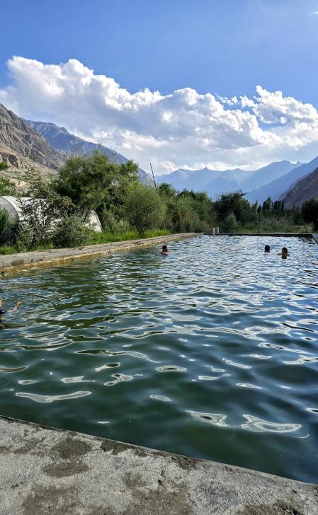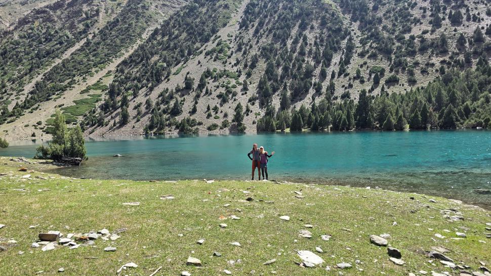 Nach einem kurzen Aufenthalt im Guesthouse gehen wir mit Hakim zu Fuß zu den Fischteichen - weiter als gedacht. Dort gehen wir direkt mit einer Angel zum nächstgelegenen Teich. Harald ist zuerst dran; beim Ziehen des Köders durchs Wasser beißt eine Forelle gleich an und bleibt beim Rausholen auch gerade noch lang genug an der Angel. Antje braucht ein paar Versuche, aber mit souveränem Rausholen. Nun gut, die werden für uns zubereitet. Die anderen 4 aus dem Guesthouse kommen an, Alex, Sanaa, Megan und Heily, und wir gehen gemeinsam im Pool baden. Leider ist nun schon die Sonne hinter den Bergen. Der Fisch ist nicht so lecker zubereitet, aber Sanaa angelt noch mehr fürs Abendessen im Guesthouse. Dorthin fahren wir wieder auf der Ladefläche des Jeeps. Harald bekommt in Chatorkhand eine Rasur, und am Abend diskutieren wir, wie wir weiter planen, ohne dass wr ständig die große Italiener-Gruppe treffen. Wir beschließen, zu den Shukargha Seen zu wandern und erst 2 Tage später auf die geplante Tour zu gehen.
