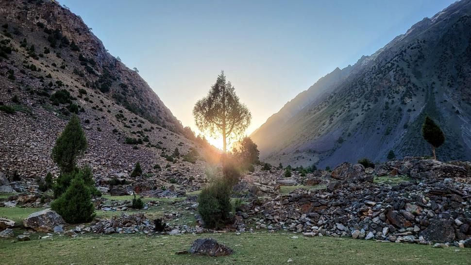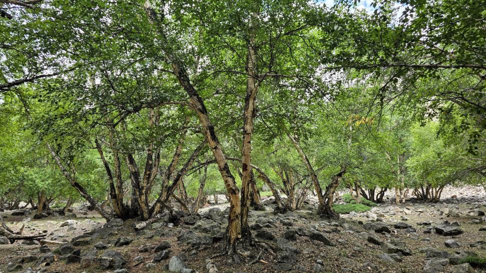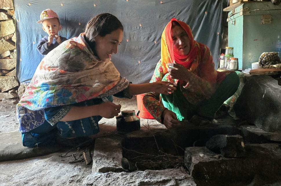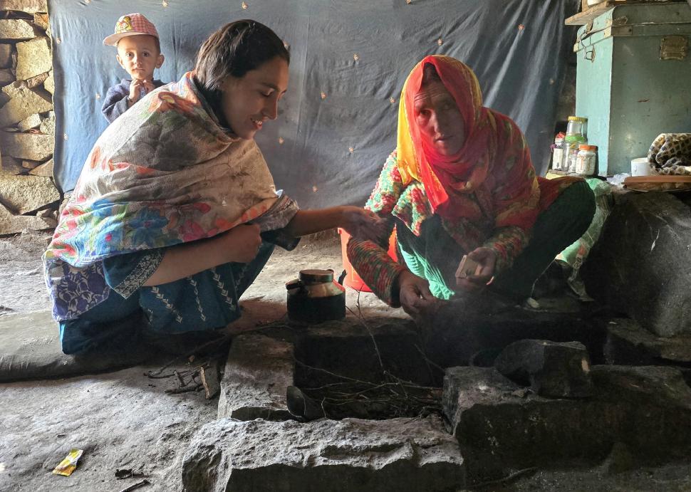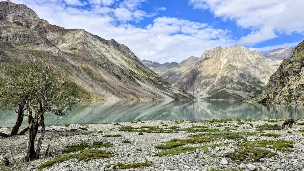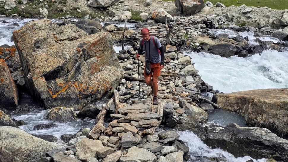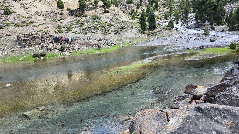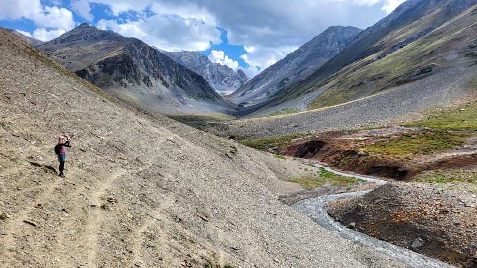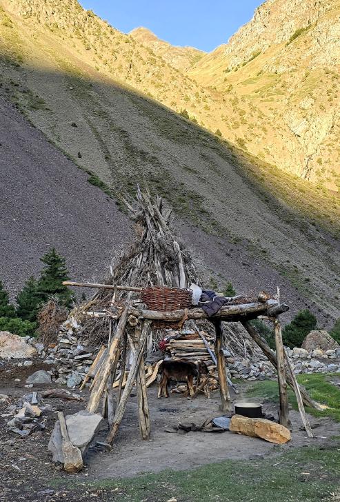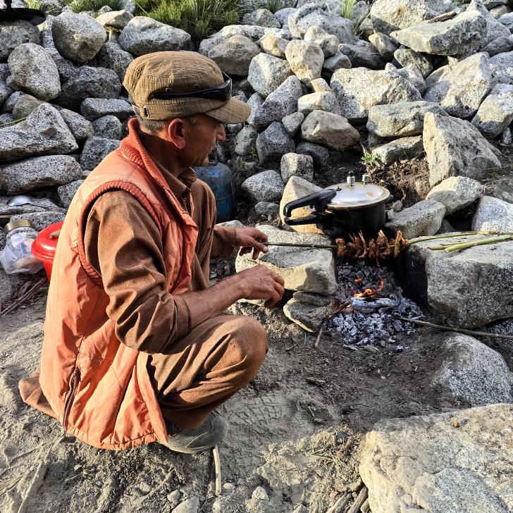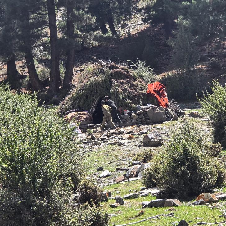 Die Wiesen von Mahthantir sind am Morgen in der Sonne. Das Tal, das wir nun hinaufwandern, ist sehr schön mit seinen Steinen, Bäumen und plätscherndem Bach. In Shingri werden wir zu Tee und Milch eingeladen. Die ganze Familie ist interessiert. Dann wird das Gelände rauher, wir gehen auf groben Steinen und müssen noch den Fluss queren, der hier kalt ist und stark strömt. So kommen wir an den Atar See.