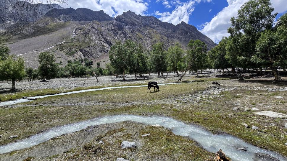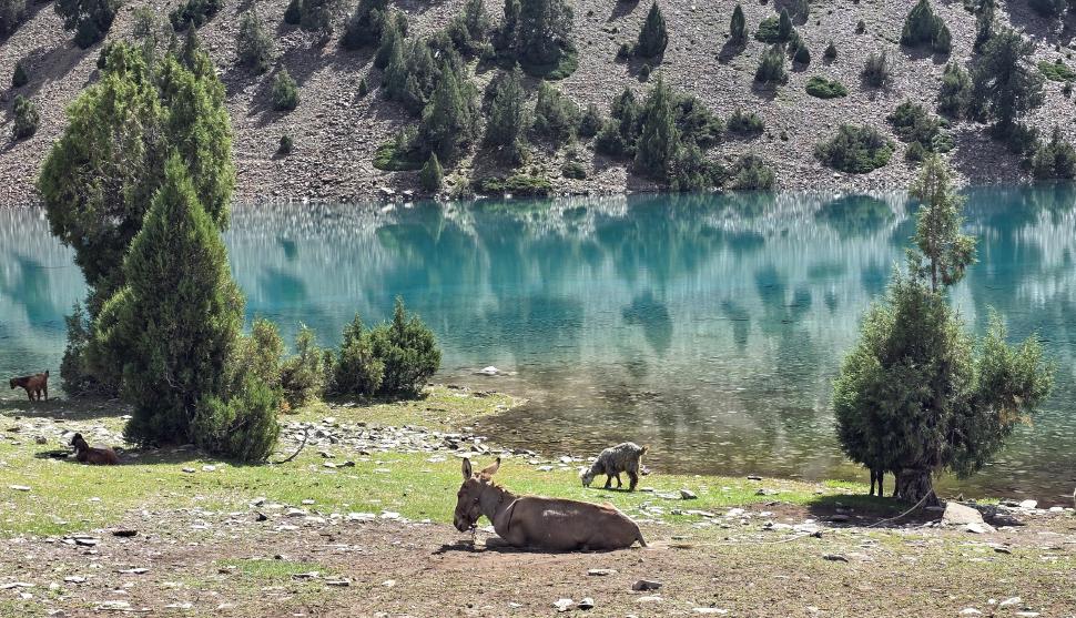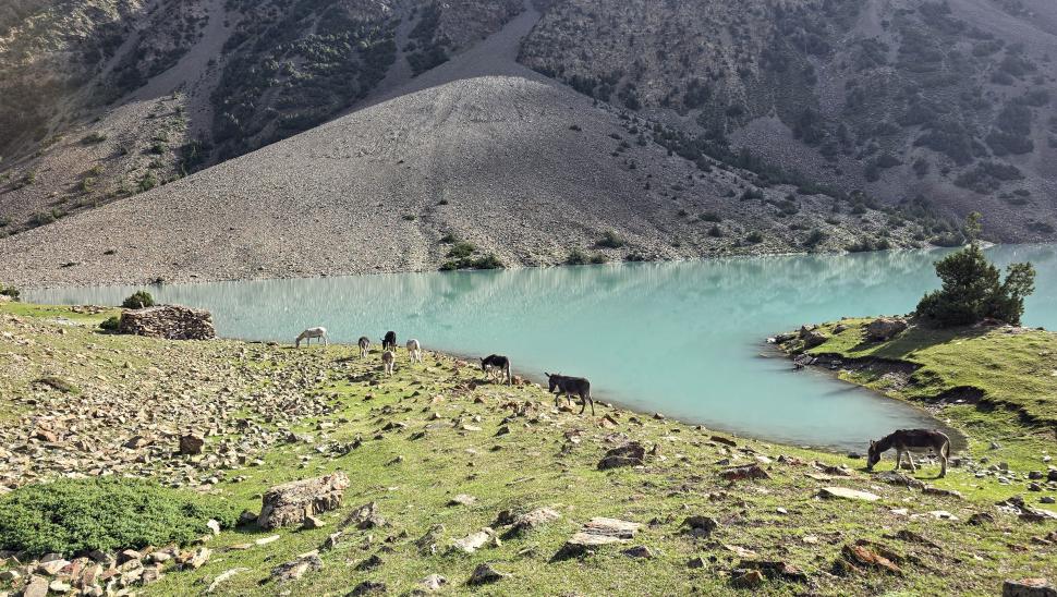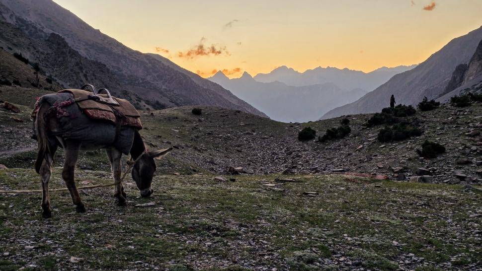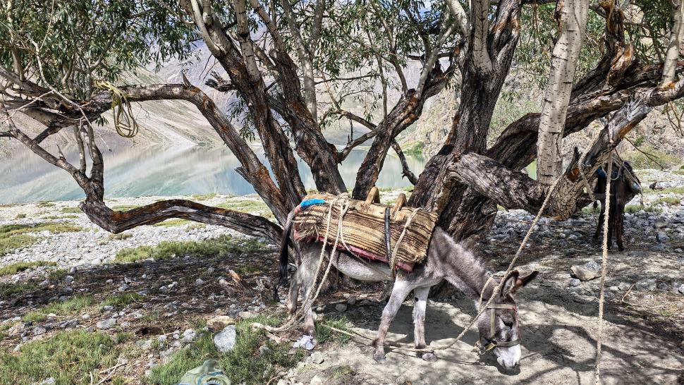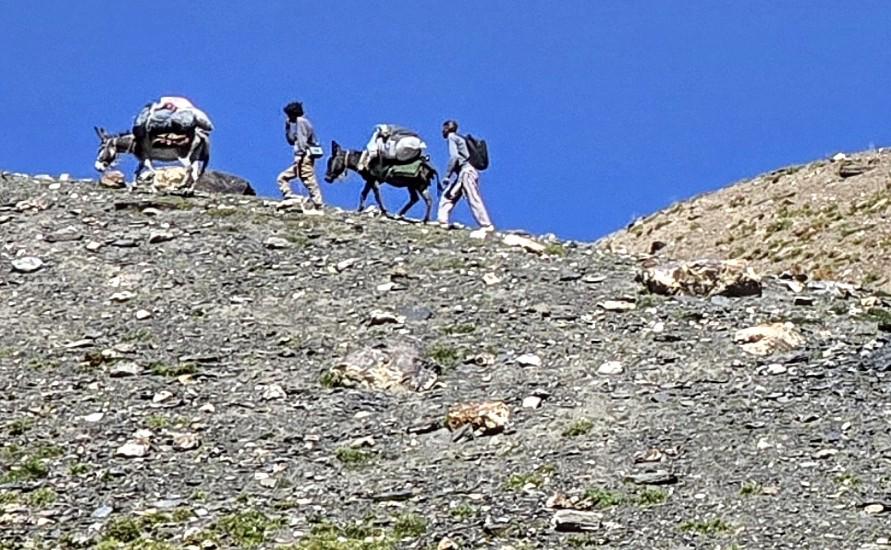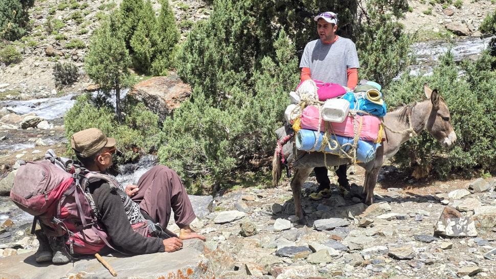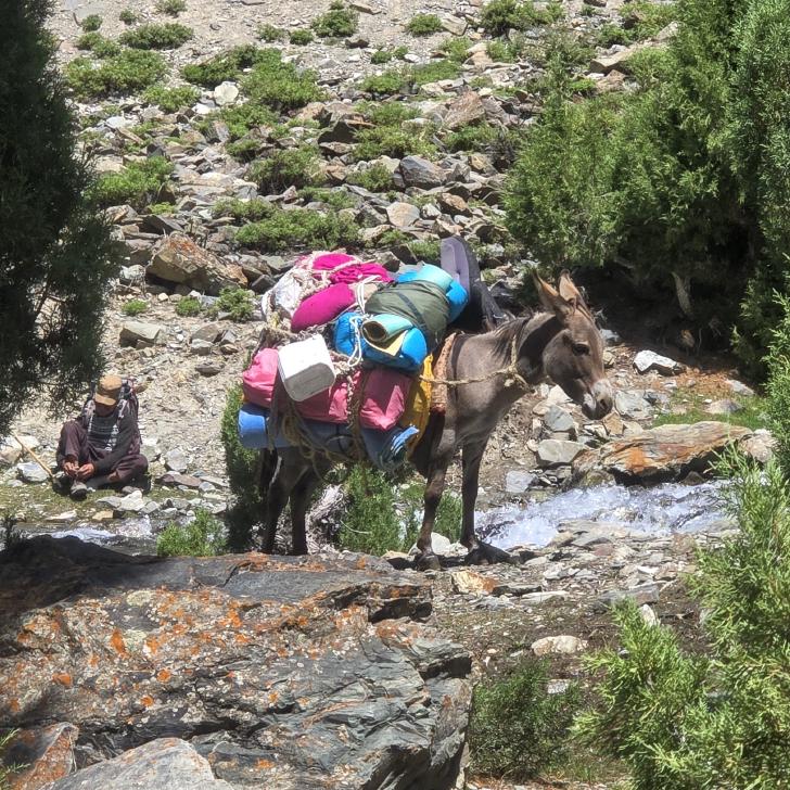 6 Uhr wecken, packen und frühstücken. So früh sehen wir im Garten einen gelben Vogel, Mayon - ist es ein Verwandter des Pirols? Wir gehen wieder die Straße hinab bis Birgal. Dort treffen wir den Koch Farassad, der uns die gesamte Wanderung begleiten wird. Der Gepäcktransport muss noch organisiert werden, wofür wenig später der Esel eines Hirten zur Verfügung steht. Am Shukargha Fluss geht es aufwaärts. Immer wieder begegnen wir Leuten, dann überholen wir Megan, Heily und Amir. Was wir nicht wussten, ist, dass es ein Ausflug mit 4 Touristen ist, hm, sehr unsauber von Hakim. Am kleinen Shukargha See machen wir die Lunchpause. Der Esel muss neu gepackt werden, und der Hunger wird gestillt. Immerhin haben wir hier schon 1200 Höhenmeter geschafft, es fehlen noch 500 m.