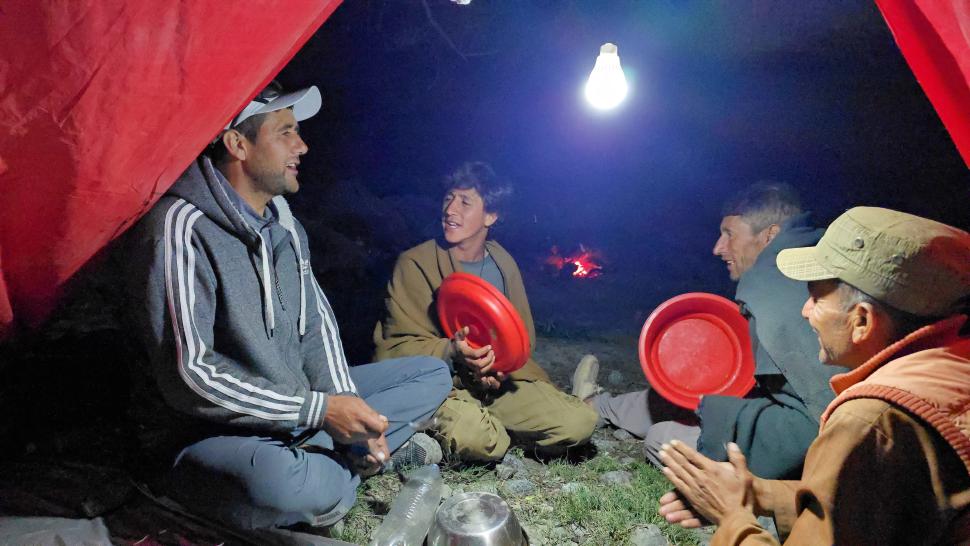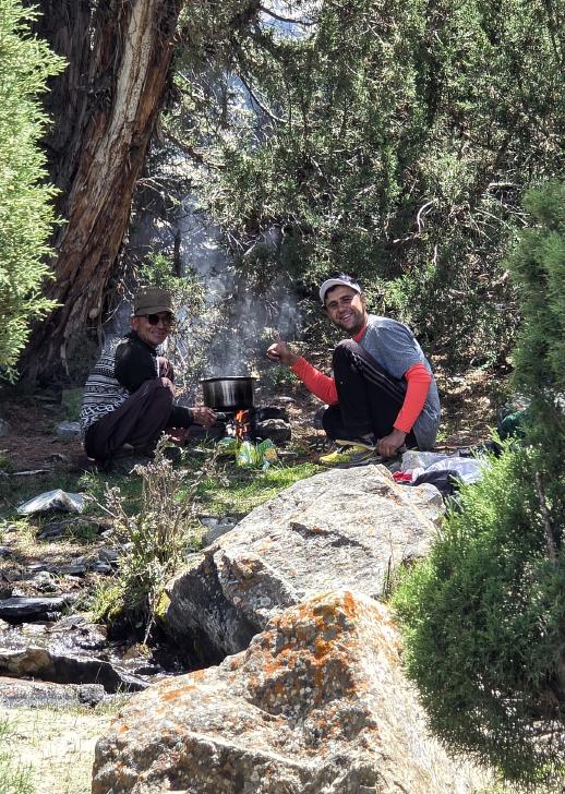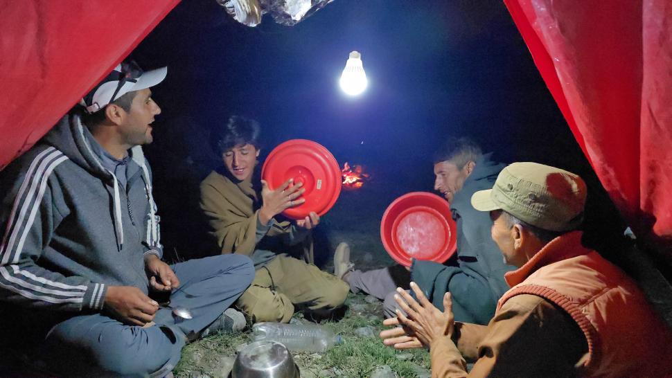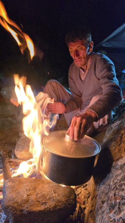 Zurück am Camp gibt es Kebab Rippchen und Besuch von Italienern, weil sie telefonieren wollen, hm, da können wir nicht helfen. Harald geht mit zum Italiener Camp und bekommt einige detaillierte handgezeichnete Karten gezeigt, nach denen die Leute vom CAI (Italienischer Alpenverein) hier ihre Bergtouren planen. Nach unserem Abendessen kommen noch die Führer der Italiener zu Besuch. Nachdem sie weg sind, machen Hakim, Farassad, Ali-Mahdad und Ahmad-Ali Musik mit Küchenutensilien und Plastikflaschen mit ihrem Hirtengesang.