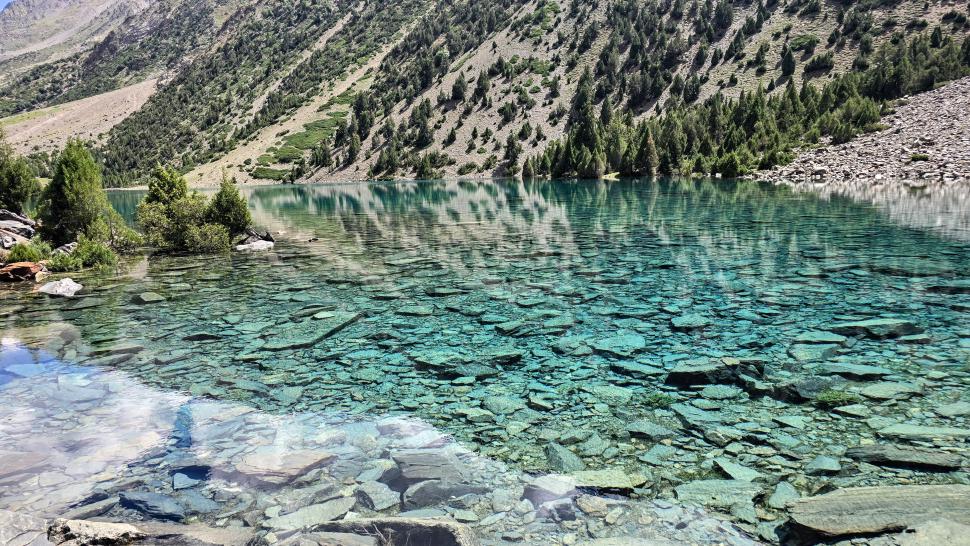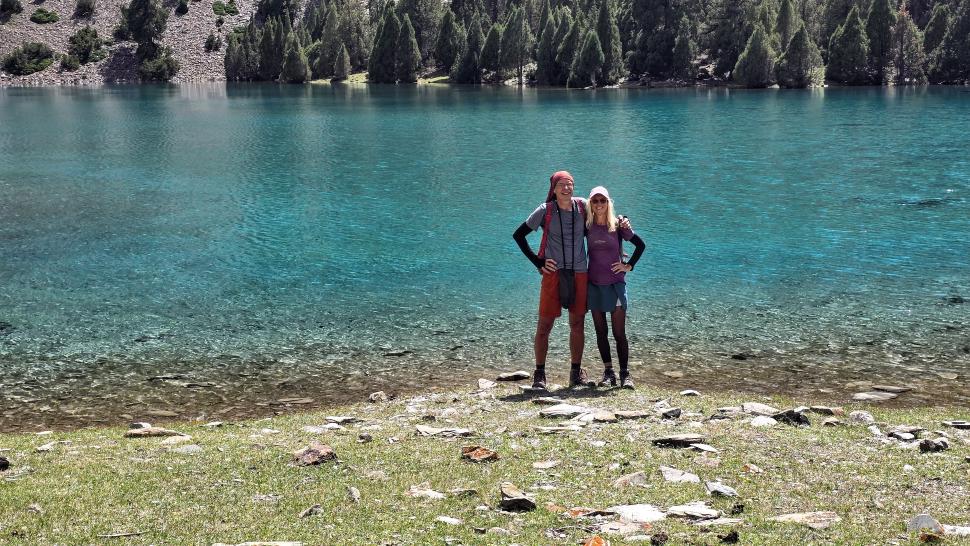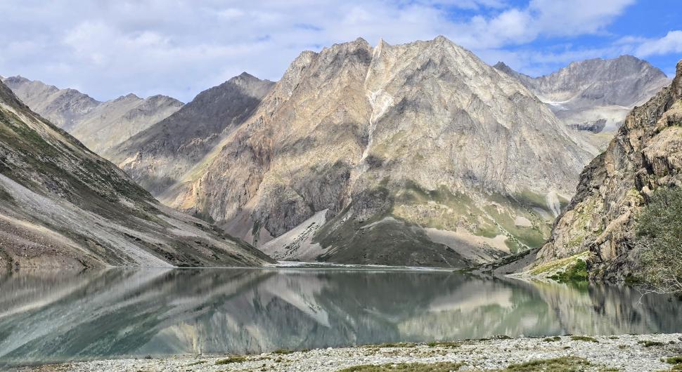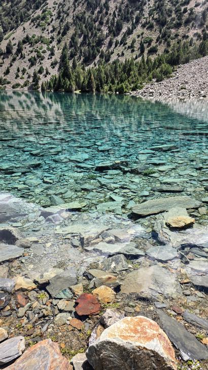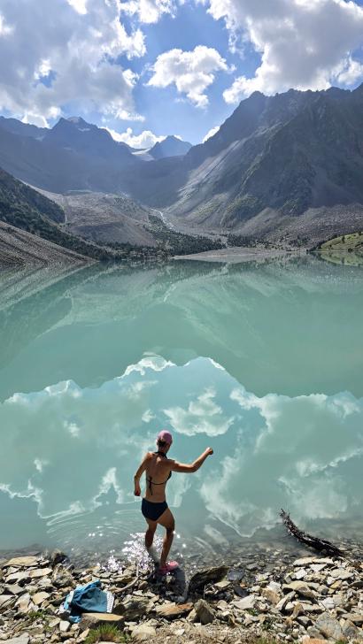 Am Morgen ist es bewölkt. So ist zwar keine Sonne auf dem Atar See, aber die Berglandschaft spiegelt sich extrem klar. Wir gehen etwas flussabwärts und über die Brücke auf die andere Seite, steigen etwas an und gehen die knapp 2 km am See entlang. Auf der anderen Seite des Sees genießen wir bei einer Pause den schönen Blick zurück. Ein wenig später furten wir durch den Atar Fluss, wieder stärker als gedacht, aber nicht so kalt. In der ausgiebigen Lunchpause sehen wir Murmeltiere und die 5000er Berge.