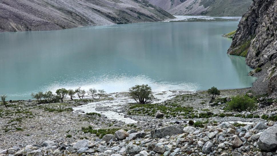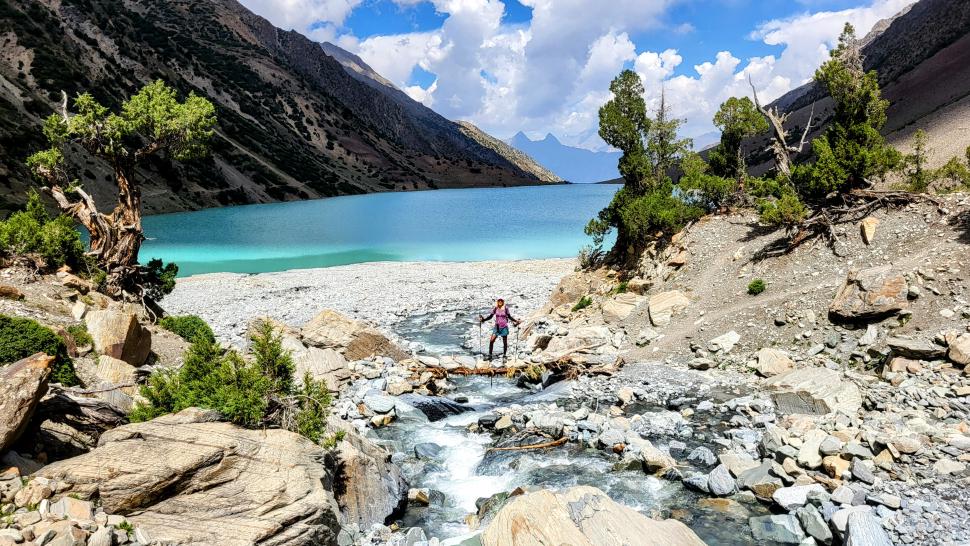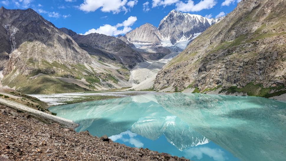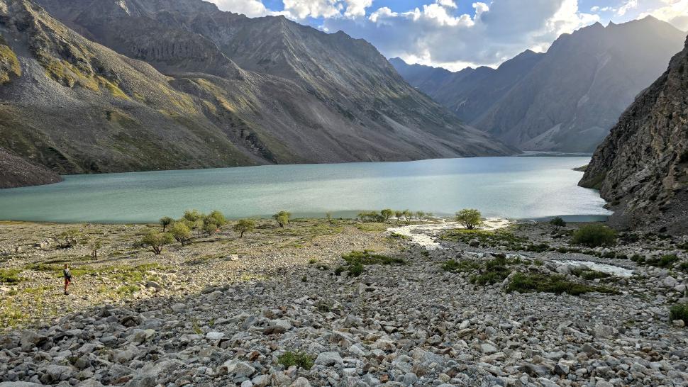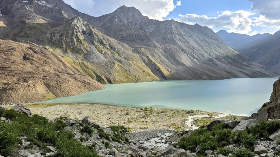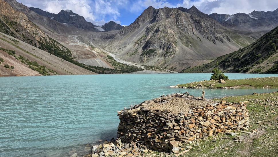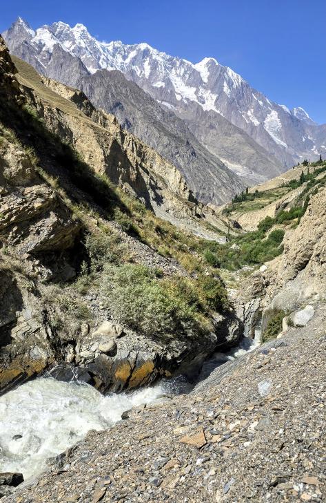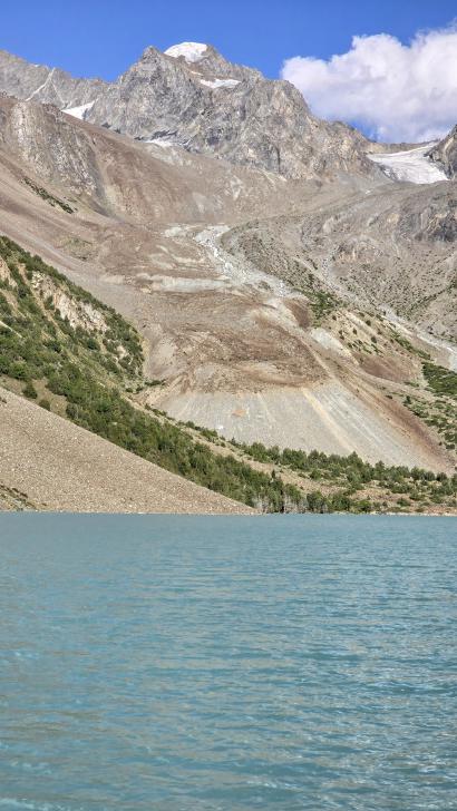 Ein wenig oberhalb ist der Fluss unterirdisch, nach einer Stunde kommen wir an den Blauen Shukargha See. Die Farbe ist faszinierend, die wir bei der ausführlichen Pause aus verschiedenen Richtungen genießen. Nach einer weiteren Wanderstunde erreichen wir unser Ziel, den großen Shukargha See. Er ist milchig blau. Hier auf über 3700 m sieht man einige Gletscher. Unser Zelt können wir etwas entfernt von den anderen aufstellen, so dass wir nach den Unterhaltungen beim Abendessen unsere Ruhe haben.